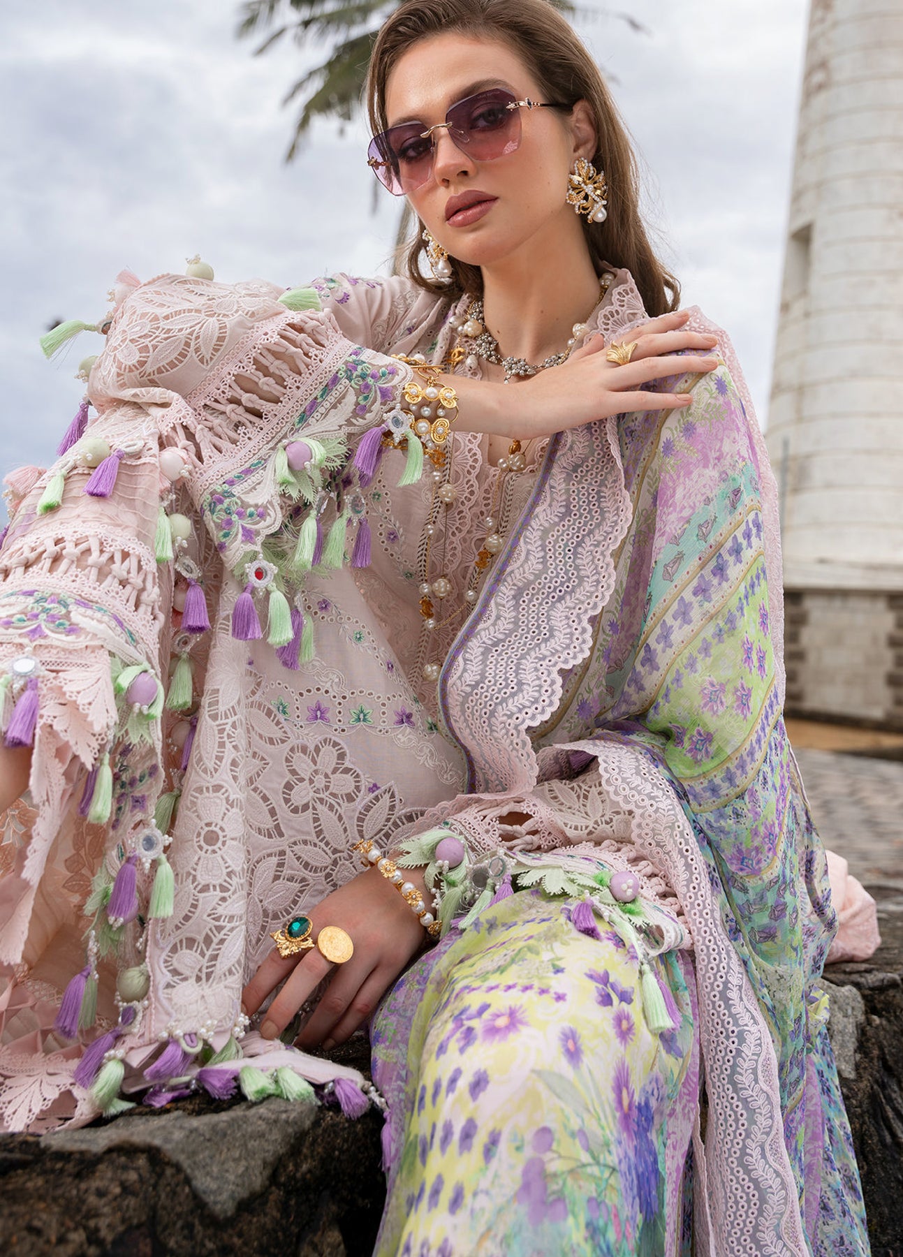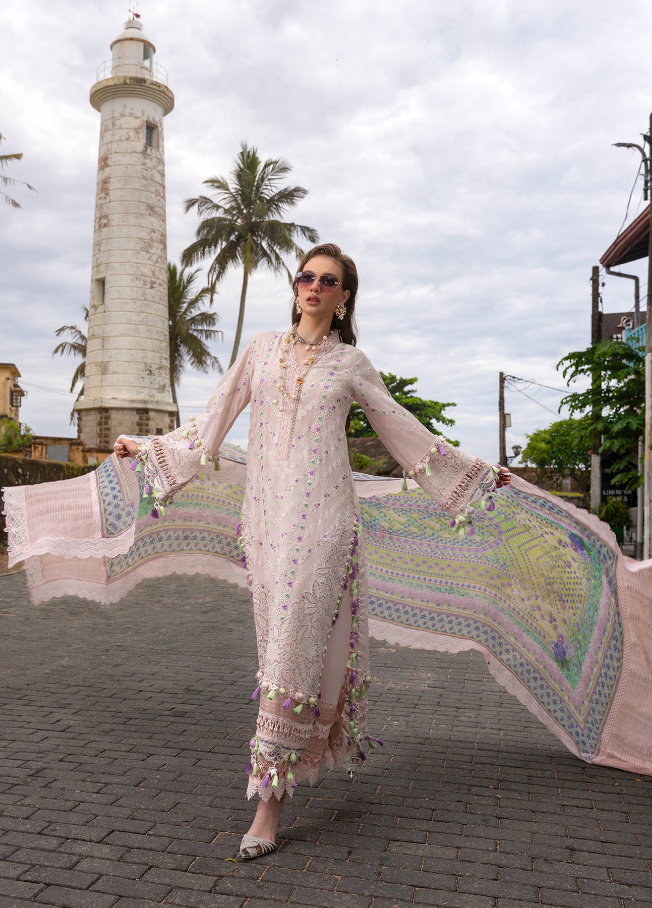 Rendered in a refreshing tonal print, "Sofi" brings together floral intricacy and refined embroidery along the neckline and front panels. Delicate organza inserts and subtle cutwork detailing lend lightness to the sleeves and hem. Styled with breathable lawn bottoms and an airy chiffon dupatta echoing its colour story, the ensemble reflects graceful movement ideal for seasonal daytime festivities.