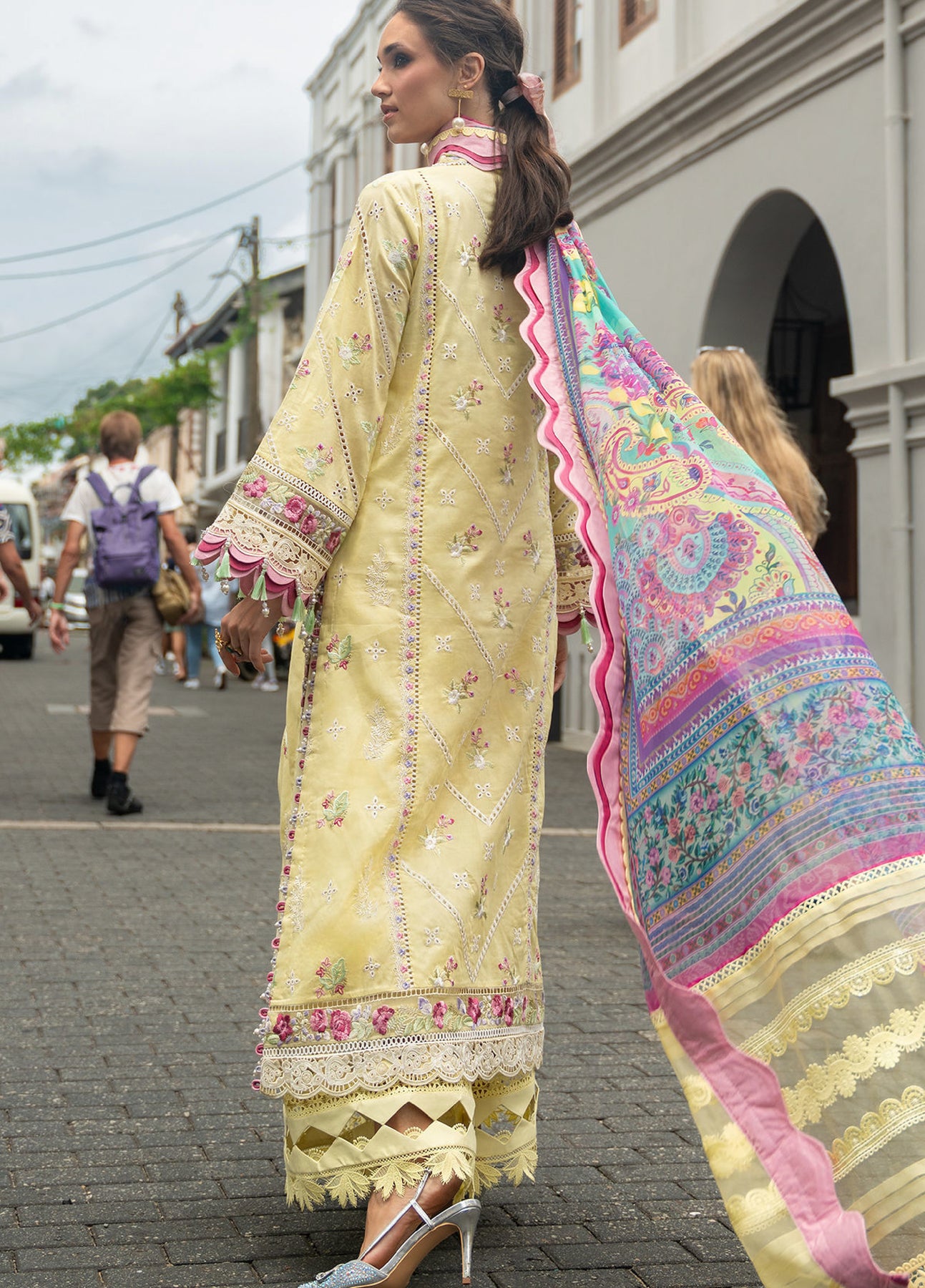 Designed on a vibrant floral canvas, "Baneera" showcases artful schiffli craftsmanship enhanced with soft thread highlights along the front and sleeve borders. The neckline is framed with delicate detailing, while organza trims finished with laser accents add dimension to the silhouette. Paired with lightweight lawn trousers and a chiffon dupatta in complementary shades, it embodies effortless summer elegance.