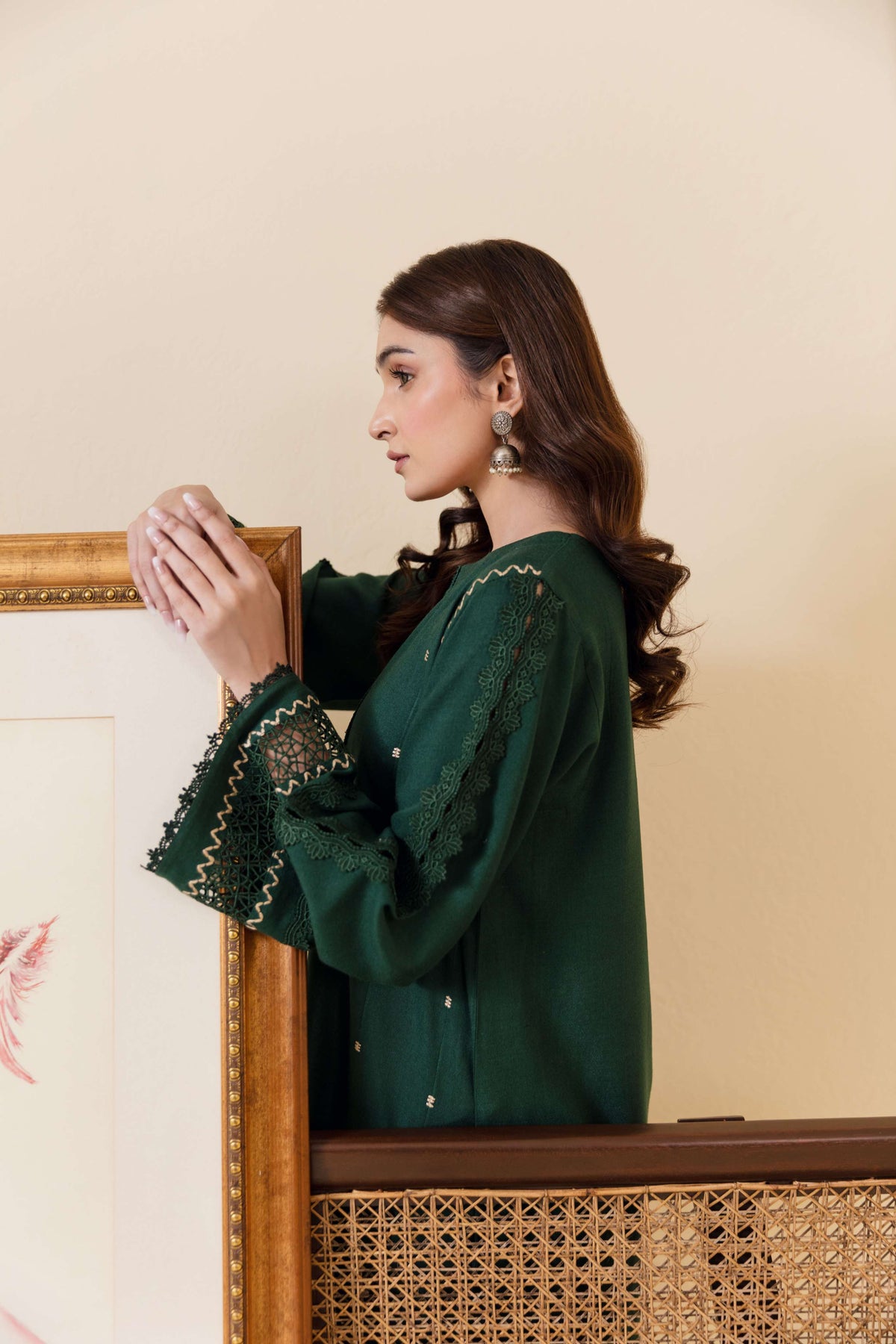 Step into winter charm with Vyne, a deep forest-green Peach Wool co-ord set accentuated with delicate golden embroidered stitches. The beautifully styled, lace-trimmed sleeves add graceful movement, while its subtle detailing brings a polished, warm elegance to your seasonal wardrobe.
