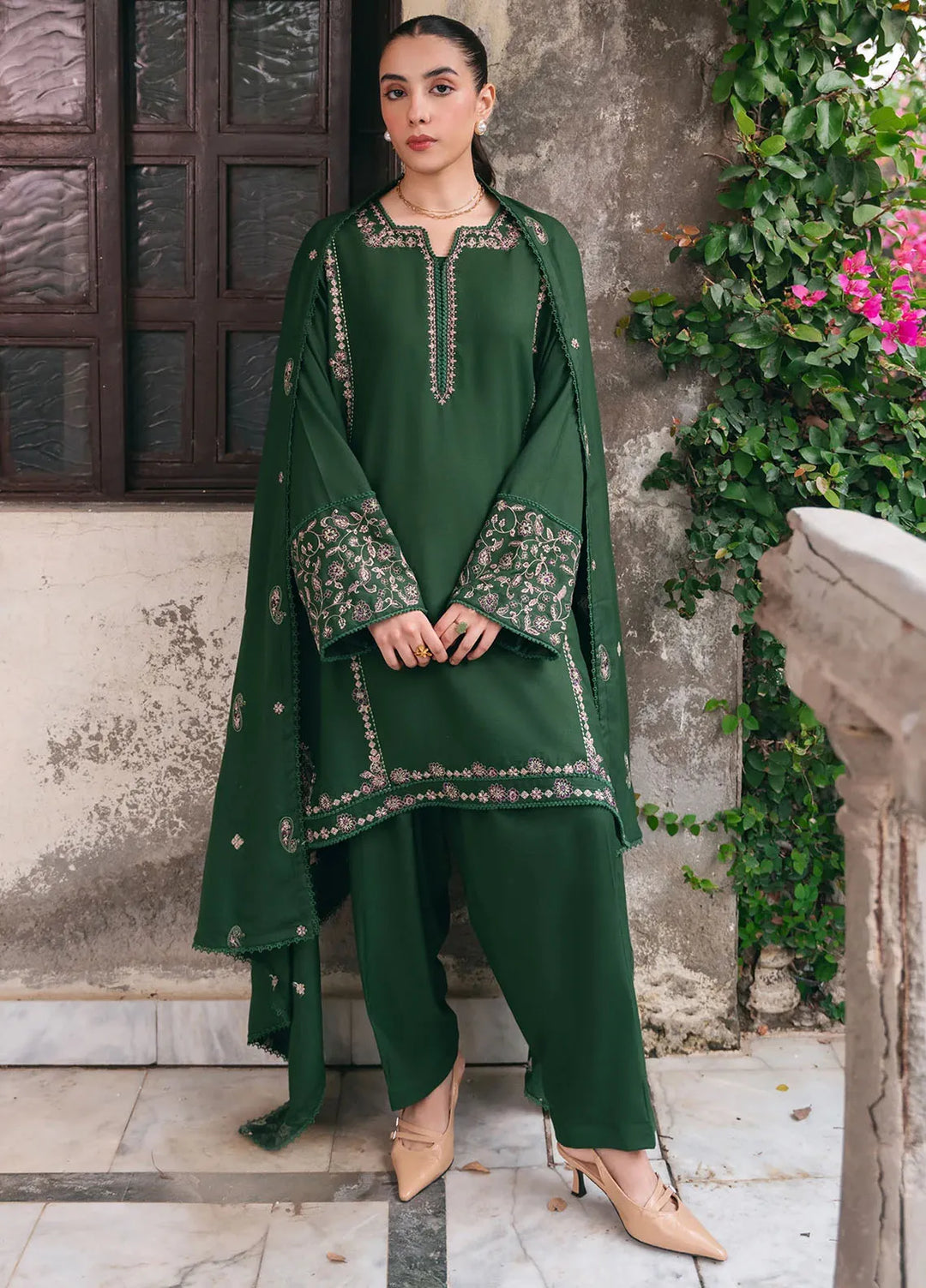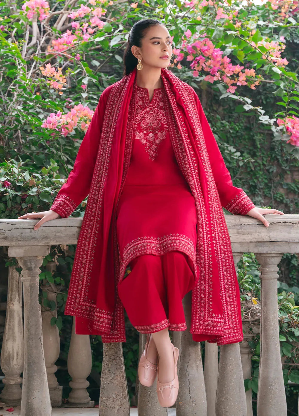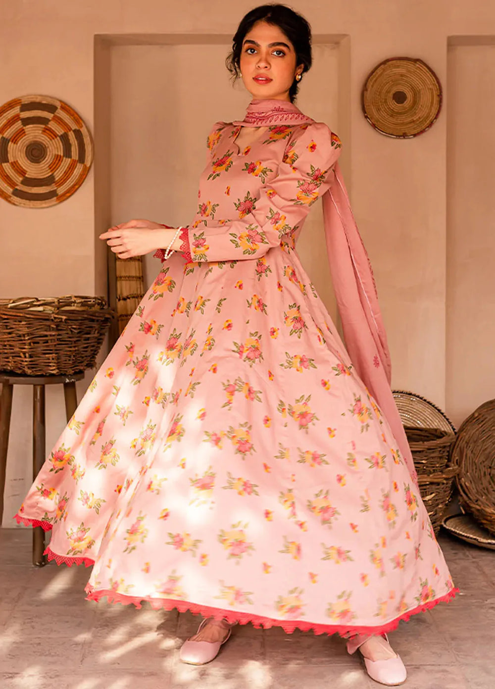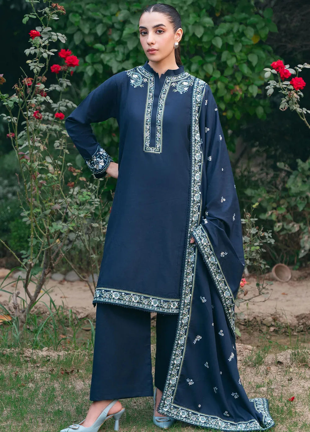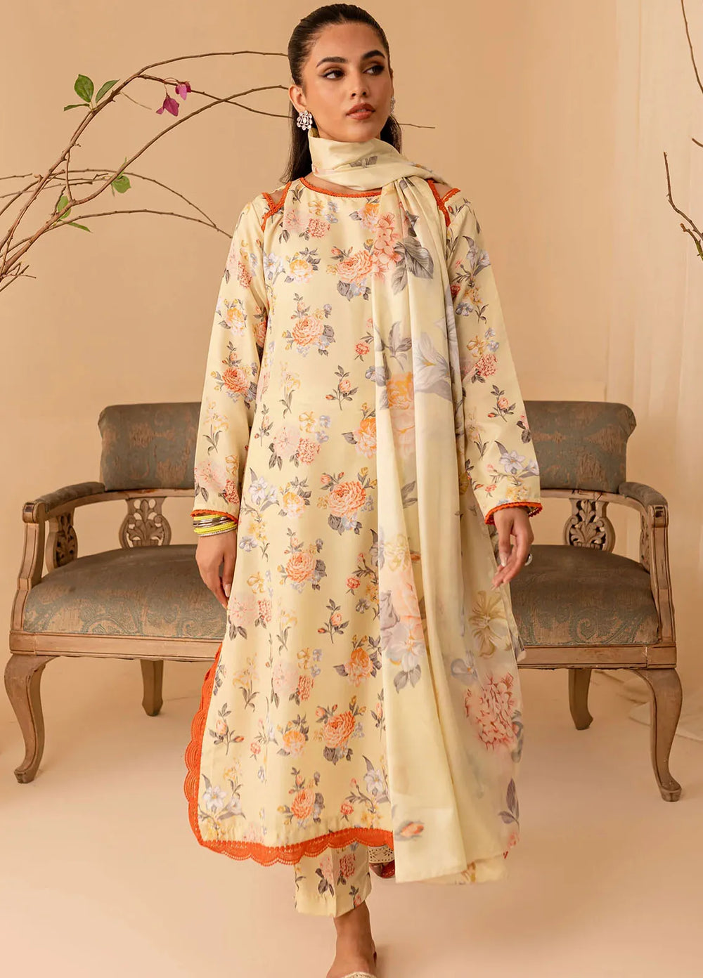 Marigold—a bright orange outfit. Made up of premium organza fabric with an embroidered front of the shirt paired with a plain shalwar and a block foil printed dupatta. The model paired it with a fawn and brown khussa, and she was looking absolutely adorable.