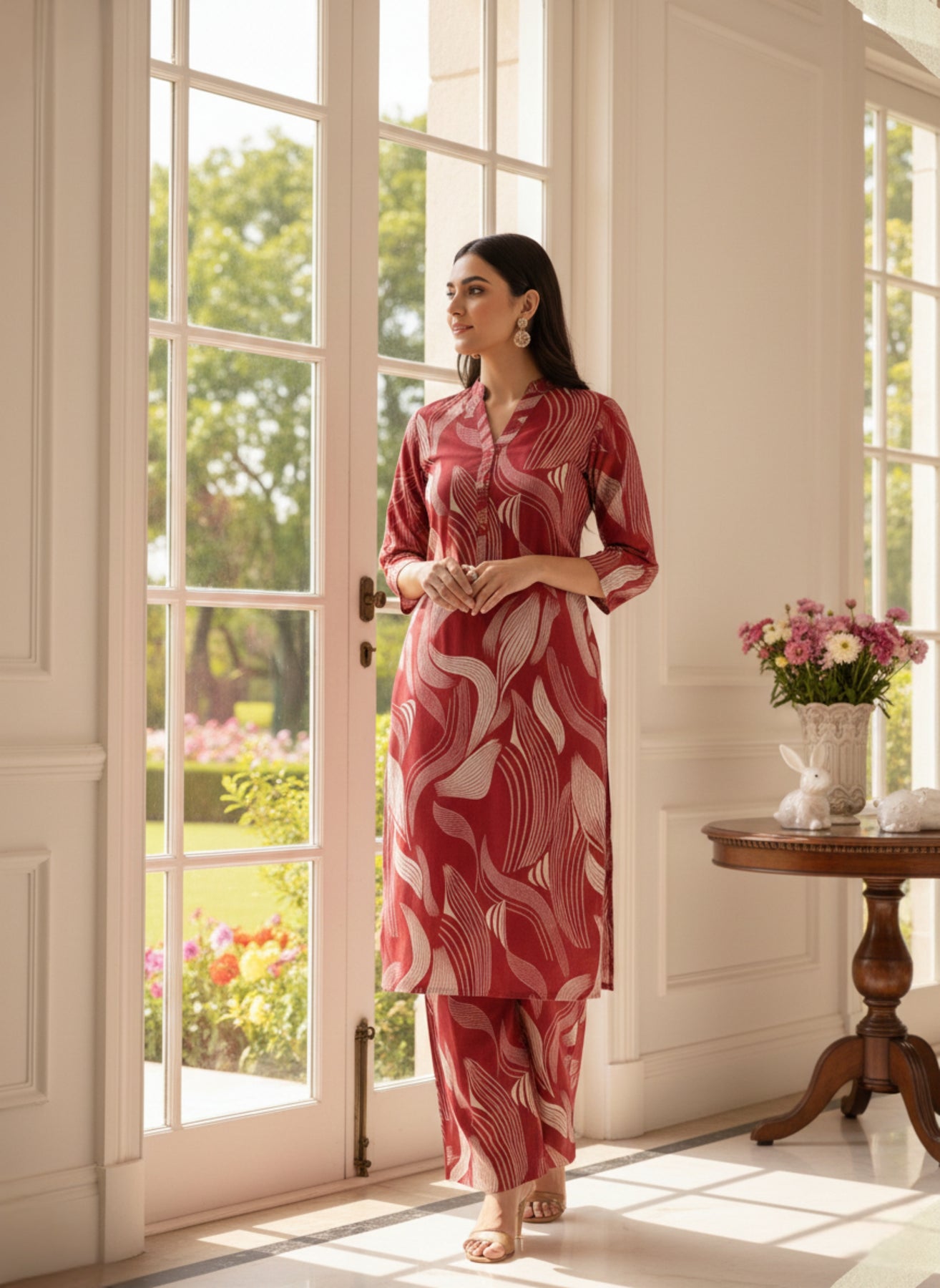 Bold maroon with contemporary abstract cream wavesโa standout piece for lovers of vibrant, modern prints.