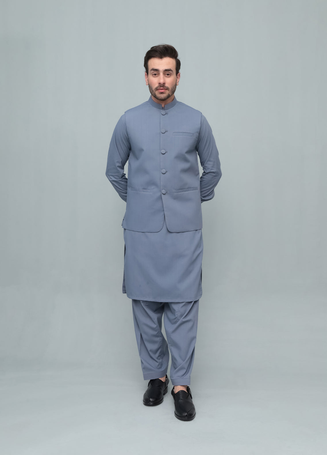 Enhance Your Style With The Bluish Gray With Blended Waistcoat - Round Cut & Matching Fabric Buttons - Men β A timeless blend of tradition and modern elegance. Featuring a round cut waistcoat, this ensemble is perfect for formal events and cultural occasions.