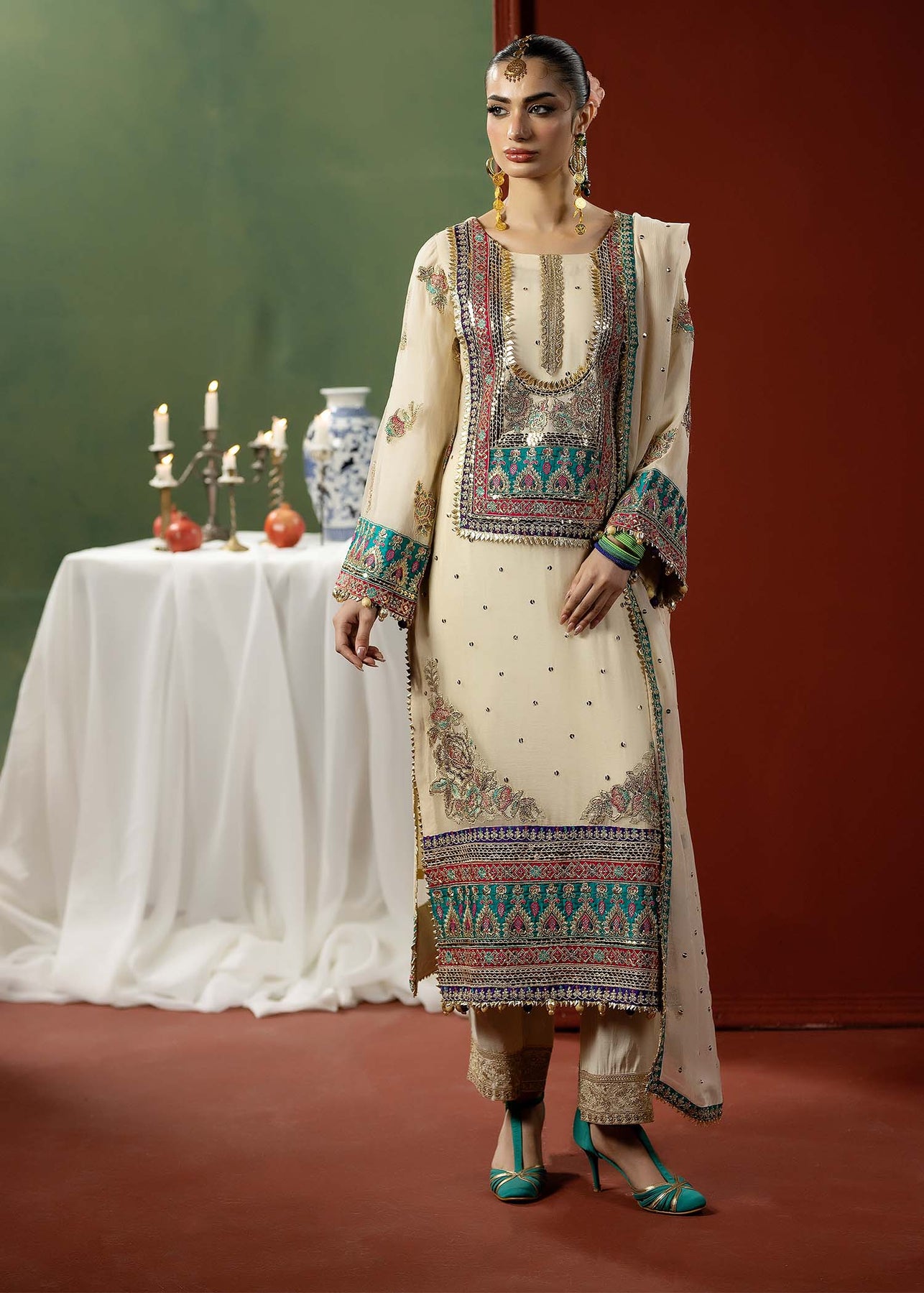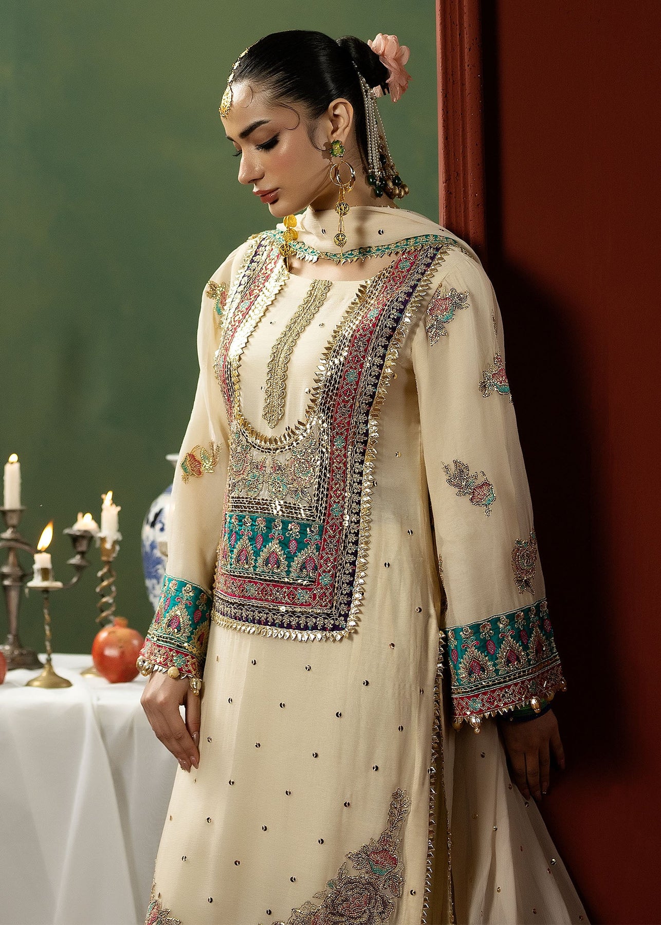 Dupatta: Embroidered chiffon dupatta with multicolor gotta work and an embroidered silk border.