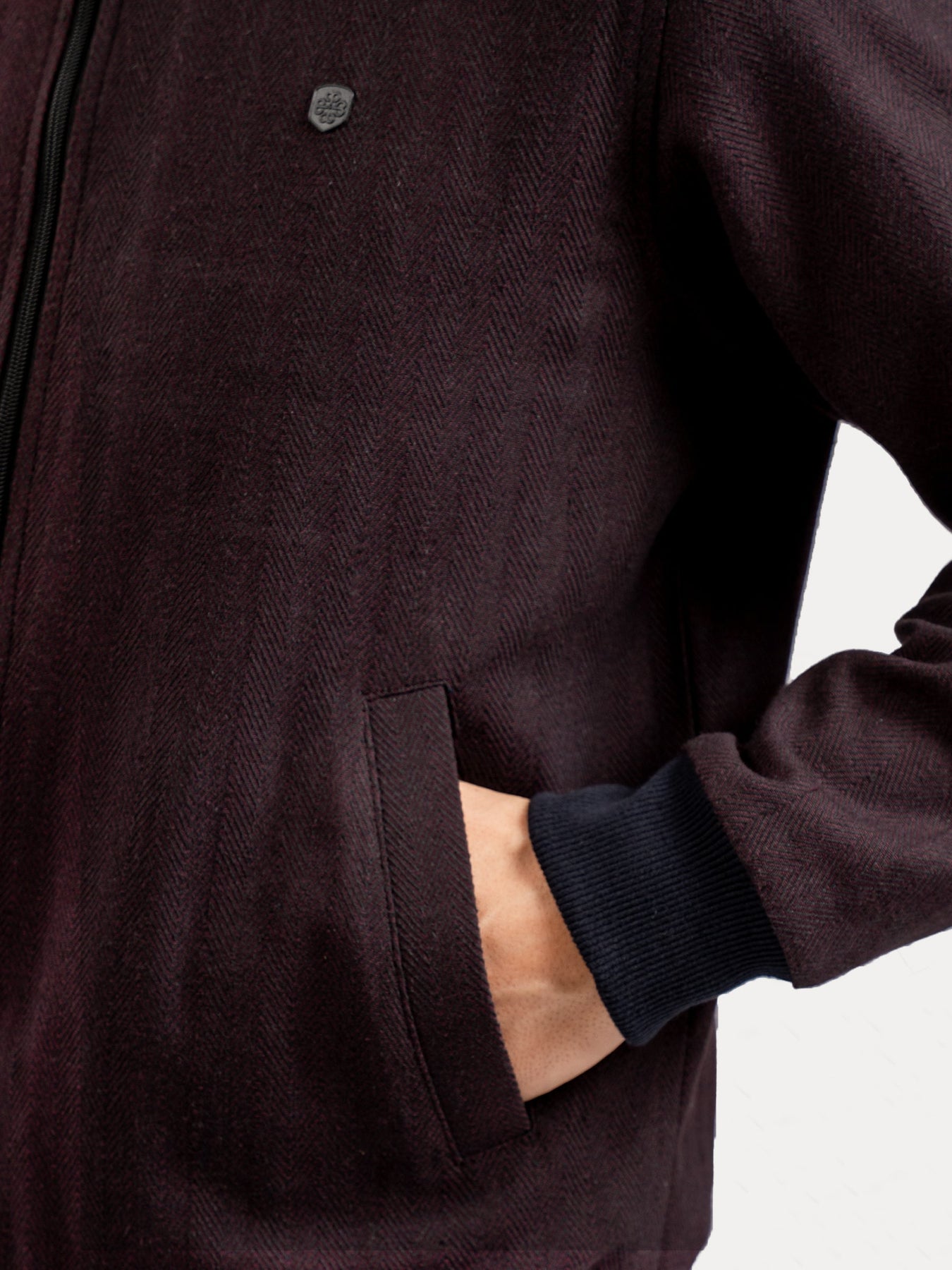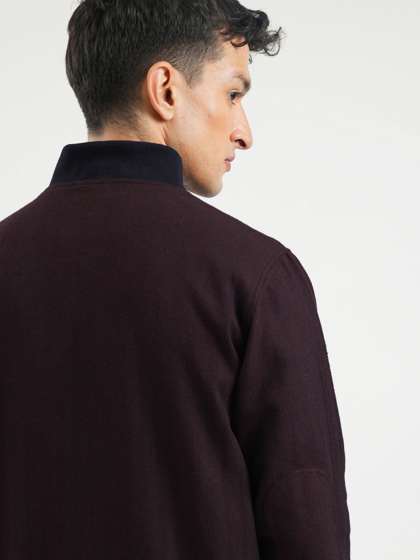 Elevate your casual look with this burgundy herringbone bomber jacket. Made with indigo dyed fabric in herringbone woven structure. This modern jacket features bomber collar & same fabric elbow patch for a casual touch. Perfetct for layering over tees or jumpers