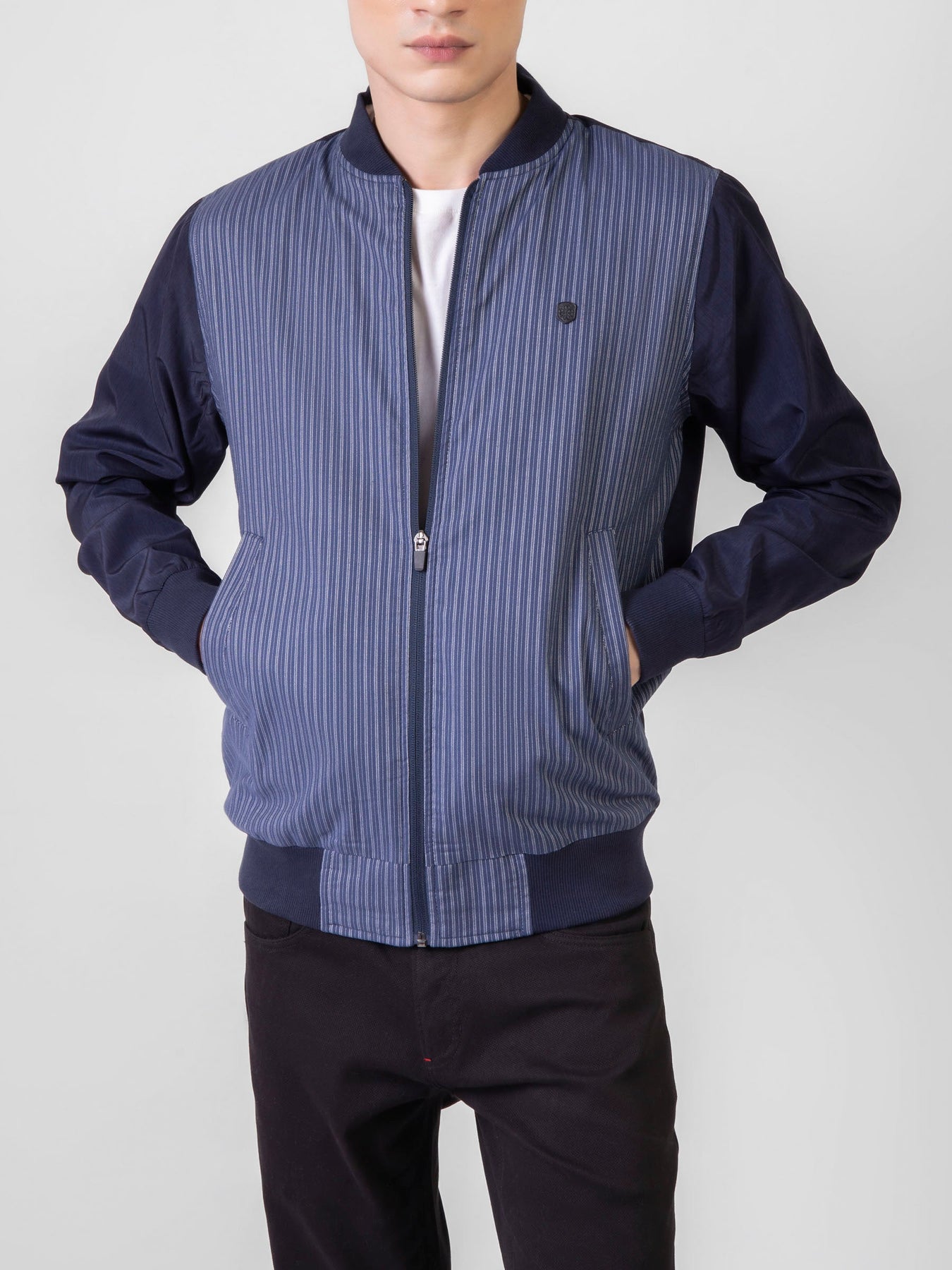 Enhance your casual look with our navy-blue light weight bomber in striped pattern. Designed for both comfort and versatility, it boasts a refined navy-blue base with striped pattern, delivering a contemporary touch. This jacket is ideal for layering during transitional seasons. Featuring a zip closure, ribbed cuffs, and a casual fit, it’s the perfect choice for casual outings or a sporty style.
