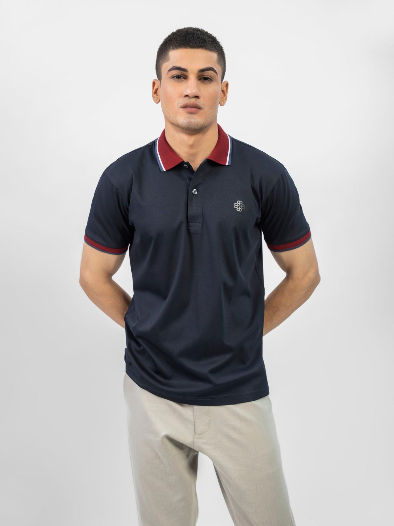 Brumano Solids Cotton Polo Navy Blue Interlock Polo With Contrasting Maroon Collar