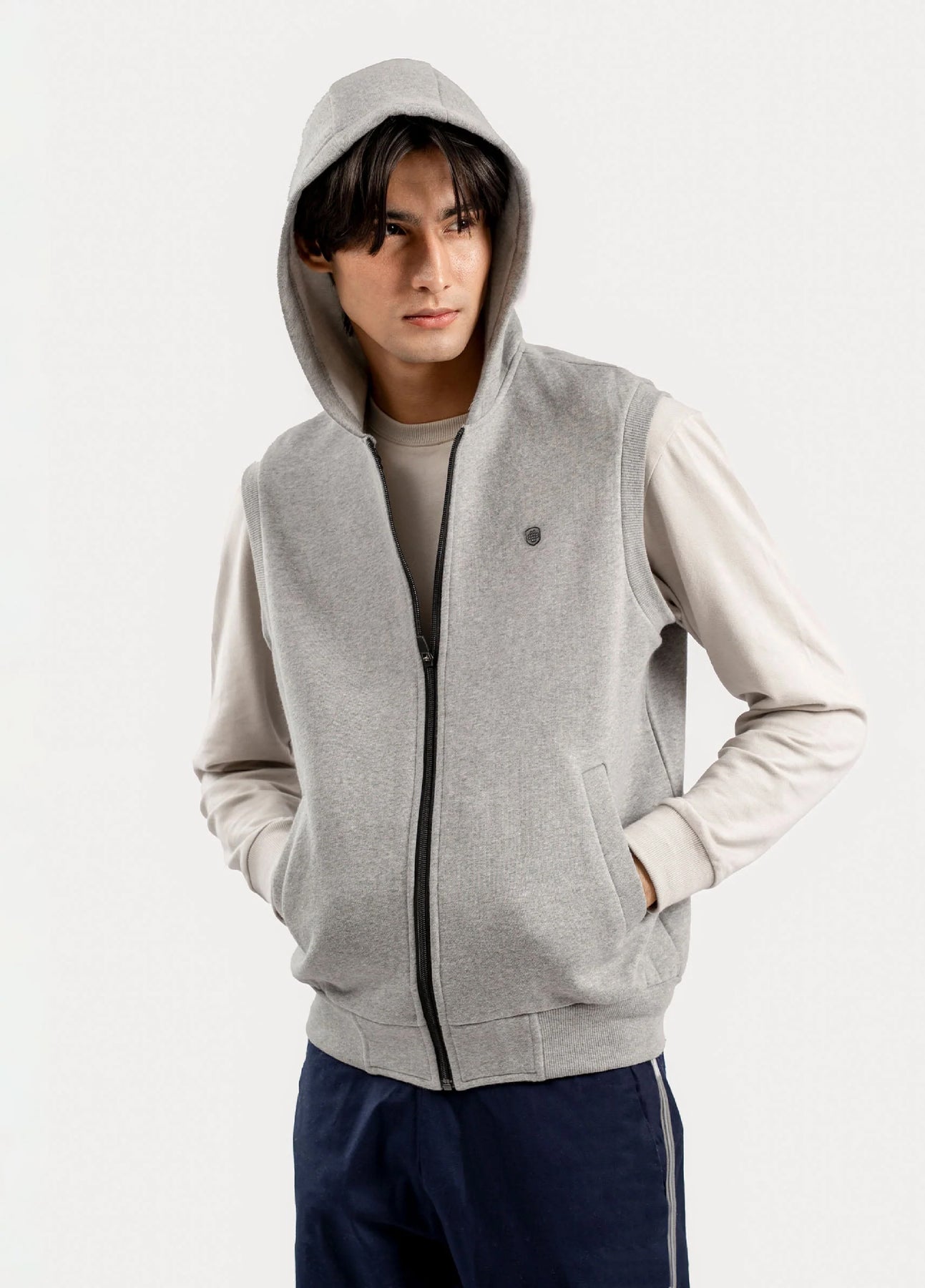 Stay stylish and comfortable with our heather grey sleeveless zipper jacket with hoodie. Made from soft fleece fabric, it features a front zipper, adjustable hoodie, and side pockets. Perfect for workouts, travel, or casual wear. A versatile essential for every season.