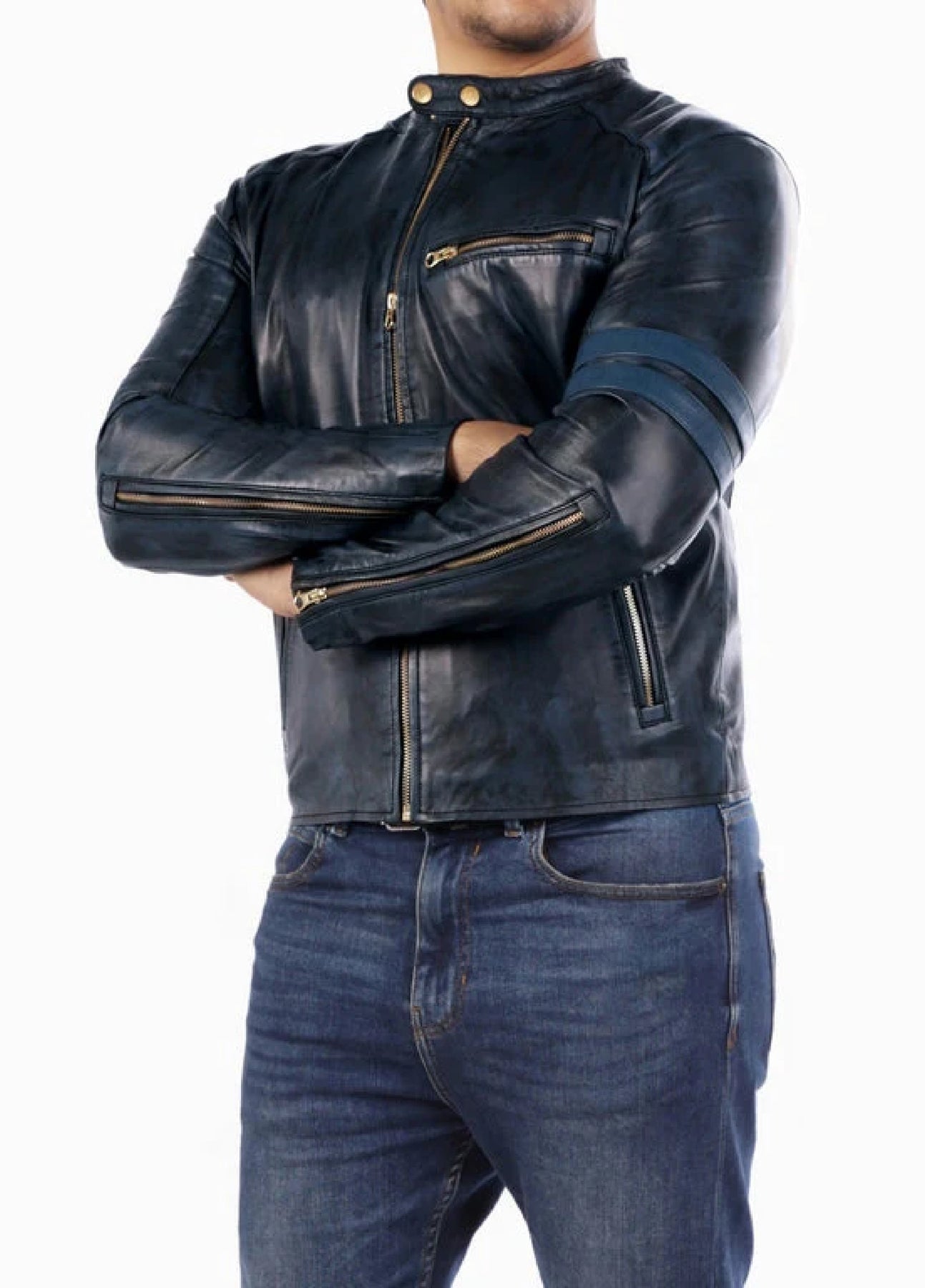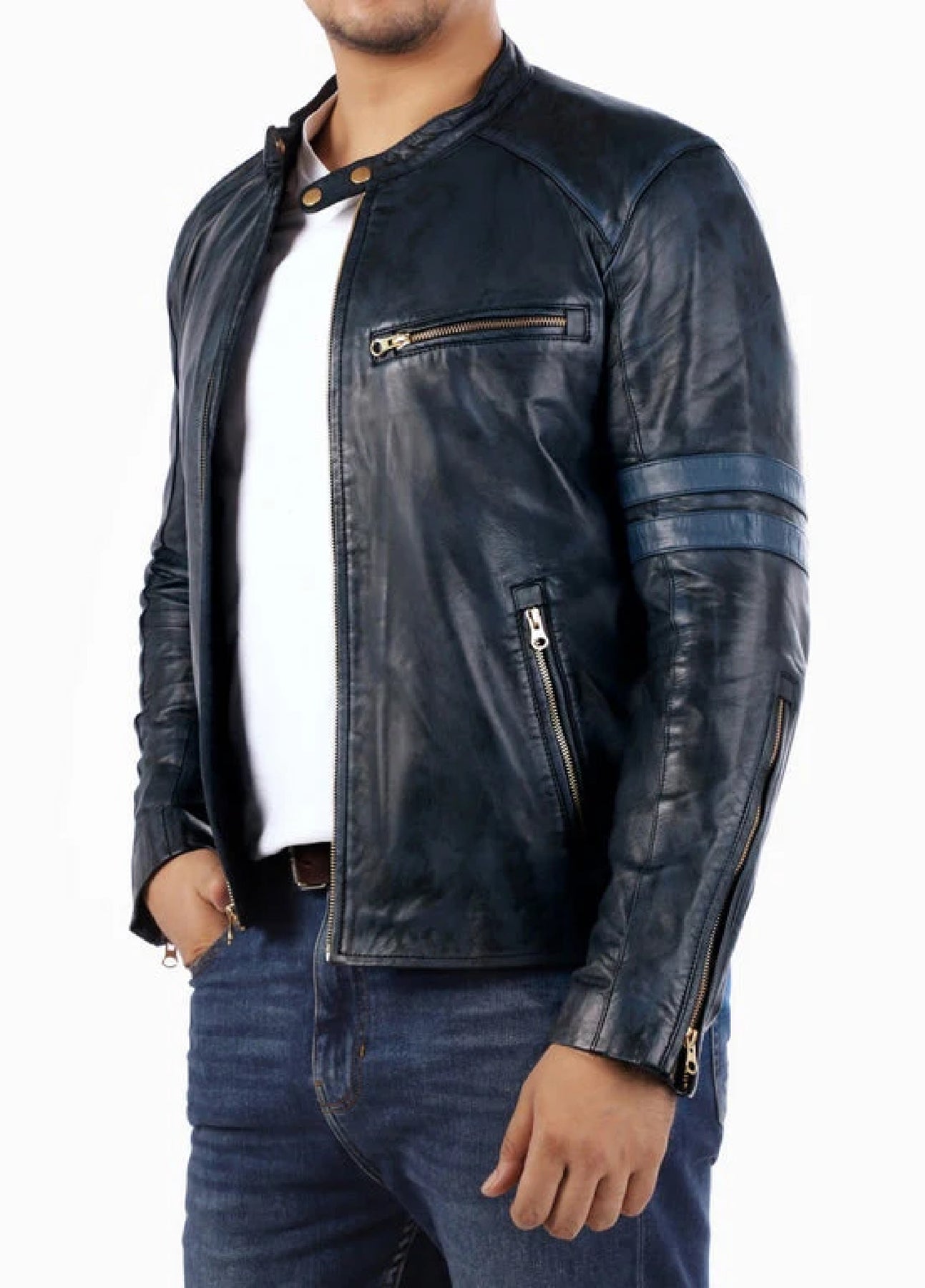 Cafe Racer Genuine Lambskin Leather Jacket-Blue