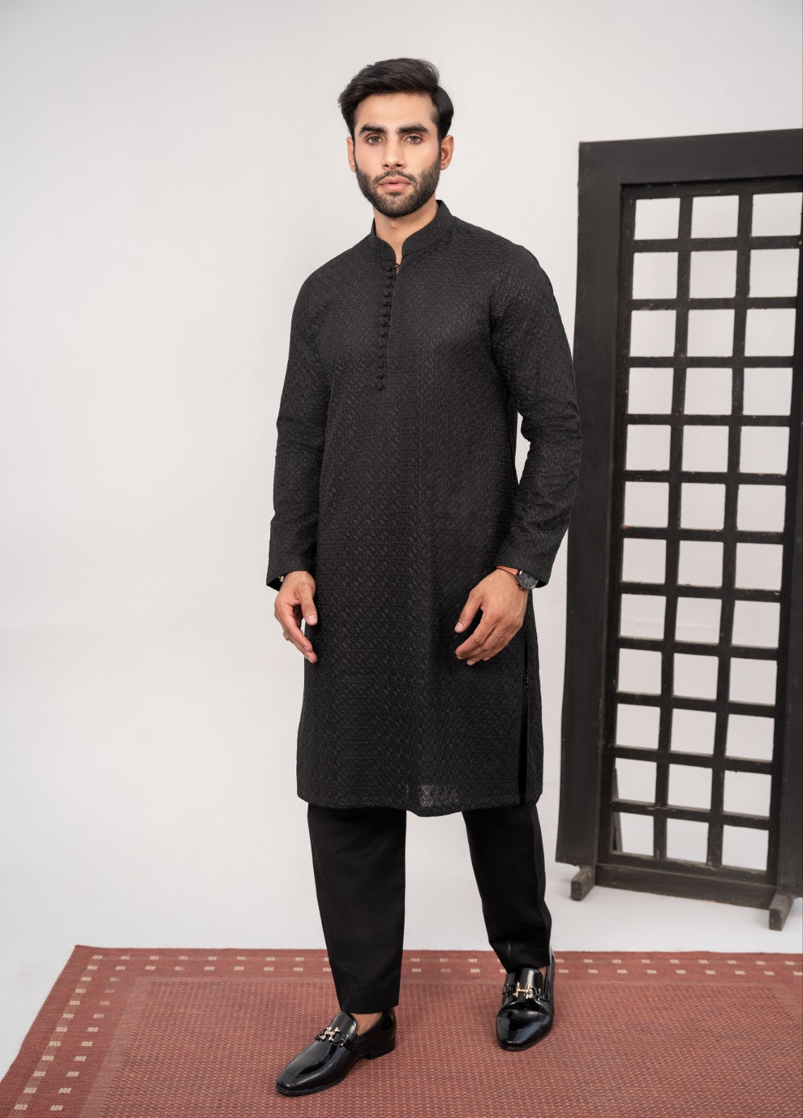 Hk Fashion Mens Ready To Wear 2 Piece Chikankari Black Chikankari Kurta Trouser - Wedding Collection