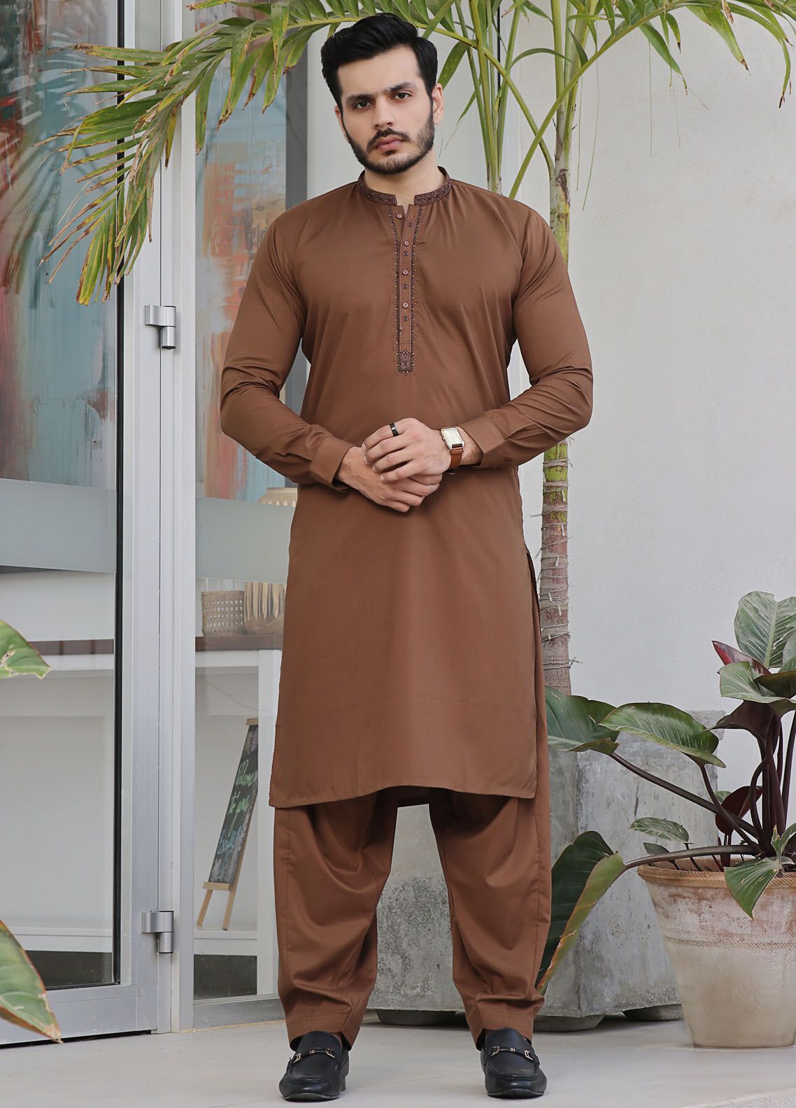Mens Formal Kameez Shalwar with Embroidery on Collar, Planket and Front