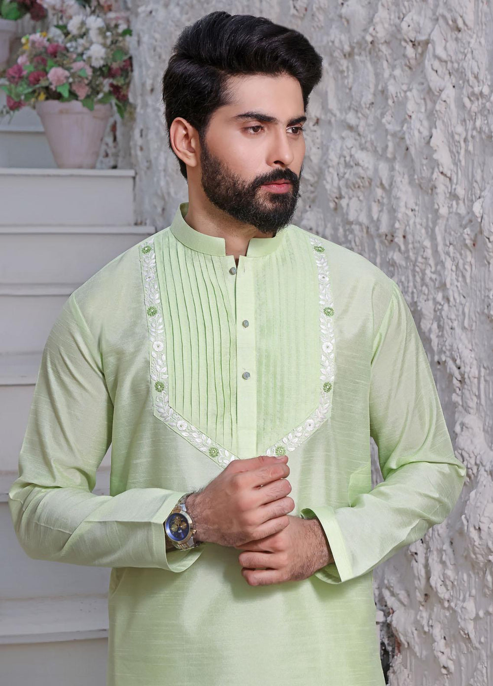 Mens Formal Kurta Pyjama On Raw Silk with Hand Embroidery with thread work on Collar, Body and Planket