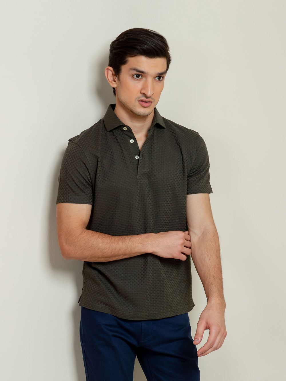 Brumano Solids Cotton Polo Olive Textured Polo With Classic Collar