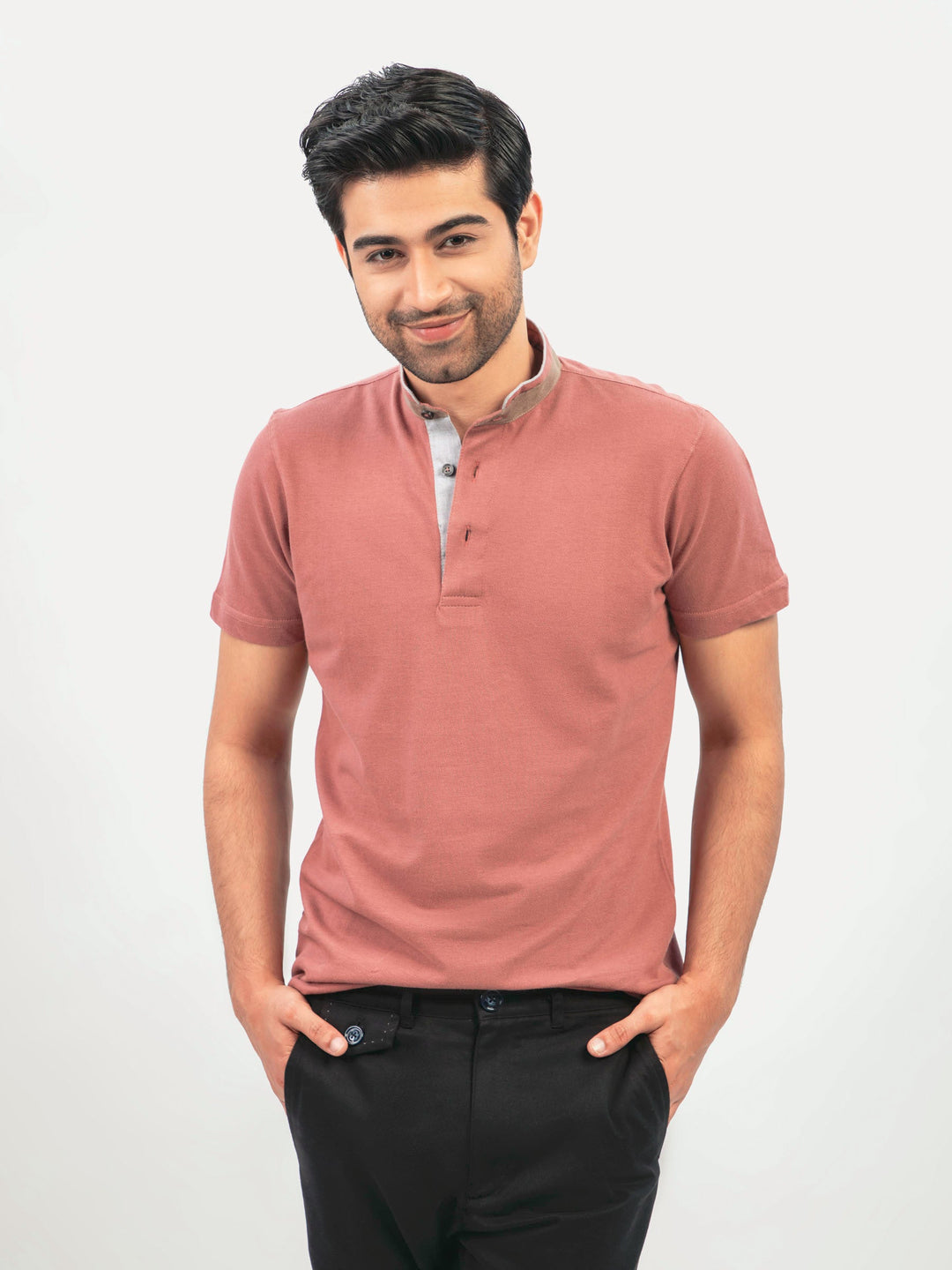 Brumano Solids Cotton Polo Tea Pink Mao Collar Polo Shirt With Detailing