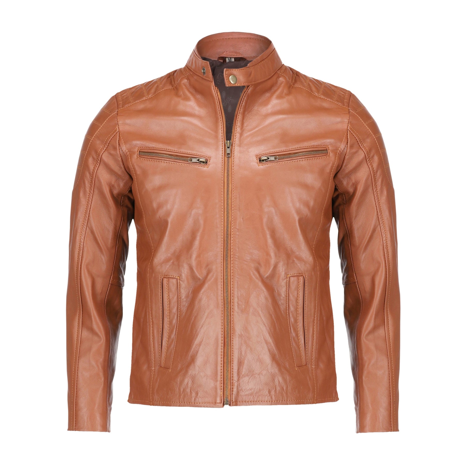 This Tan lambskin leather jacket is an ultimate trendsetter. It comes with a simple and classy design and features, front zip fastener, front zip pockets, snap button collar, and a modern fit.