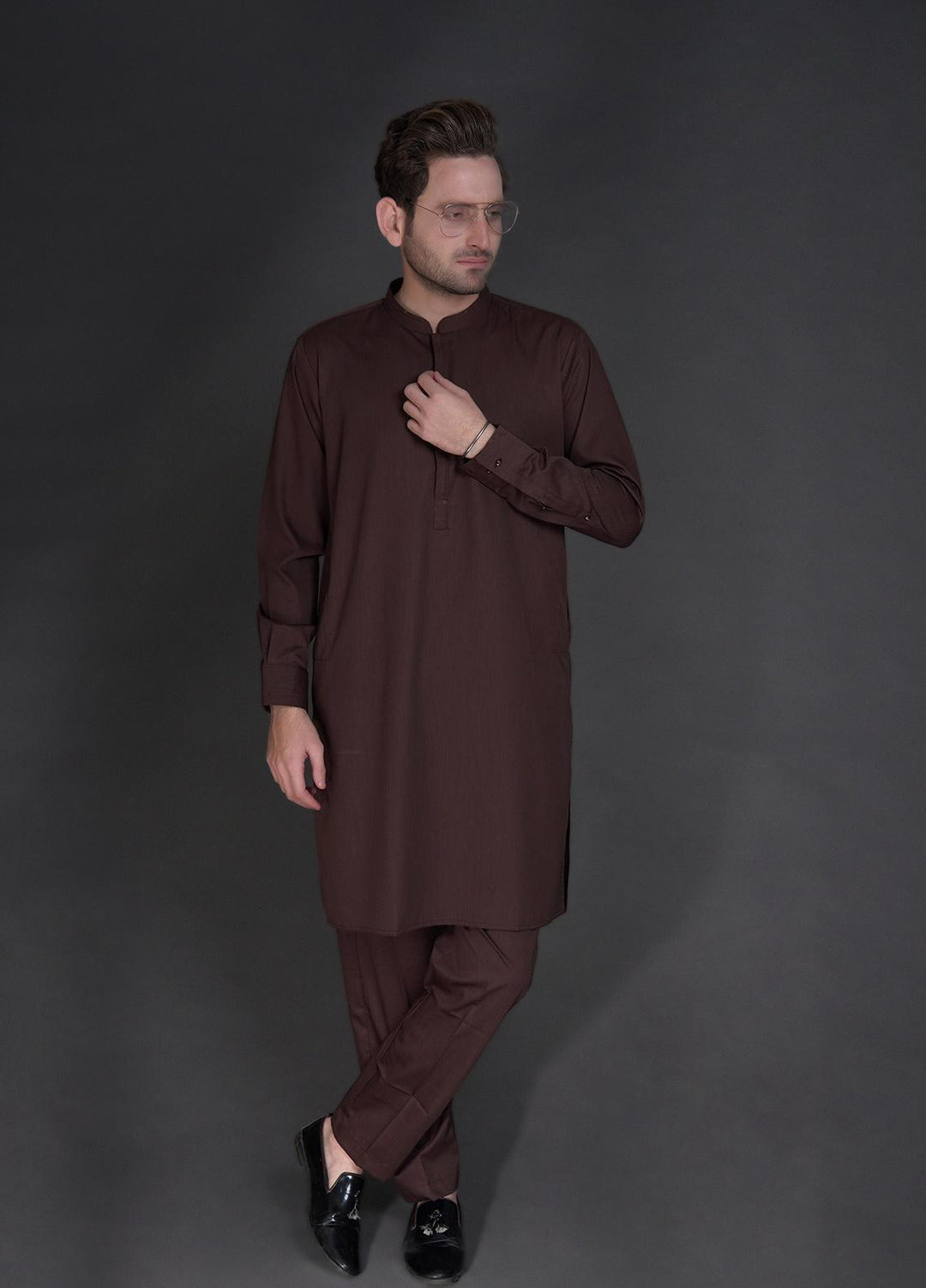 Muraqsh Blended Plain Mens Shalwar Kameez - Dark Brown French Collar