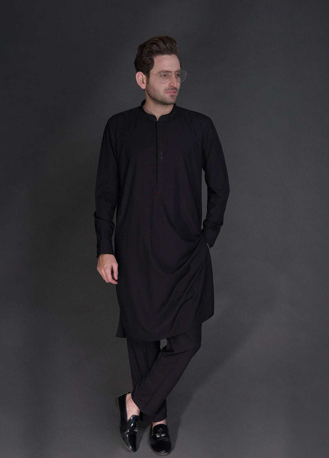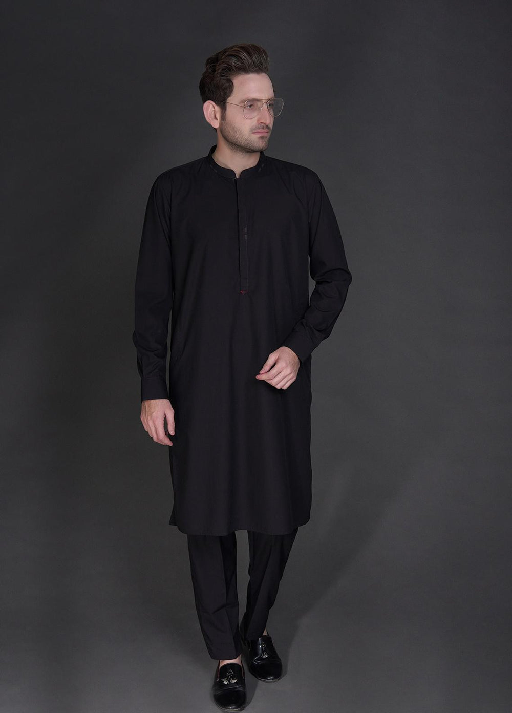 Muraqsh Blended Plain Mens Shalwar Kameez - Black French Collar