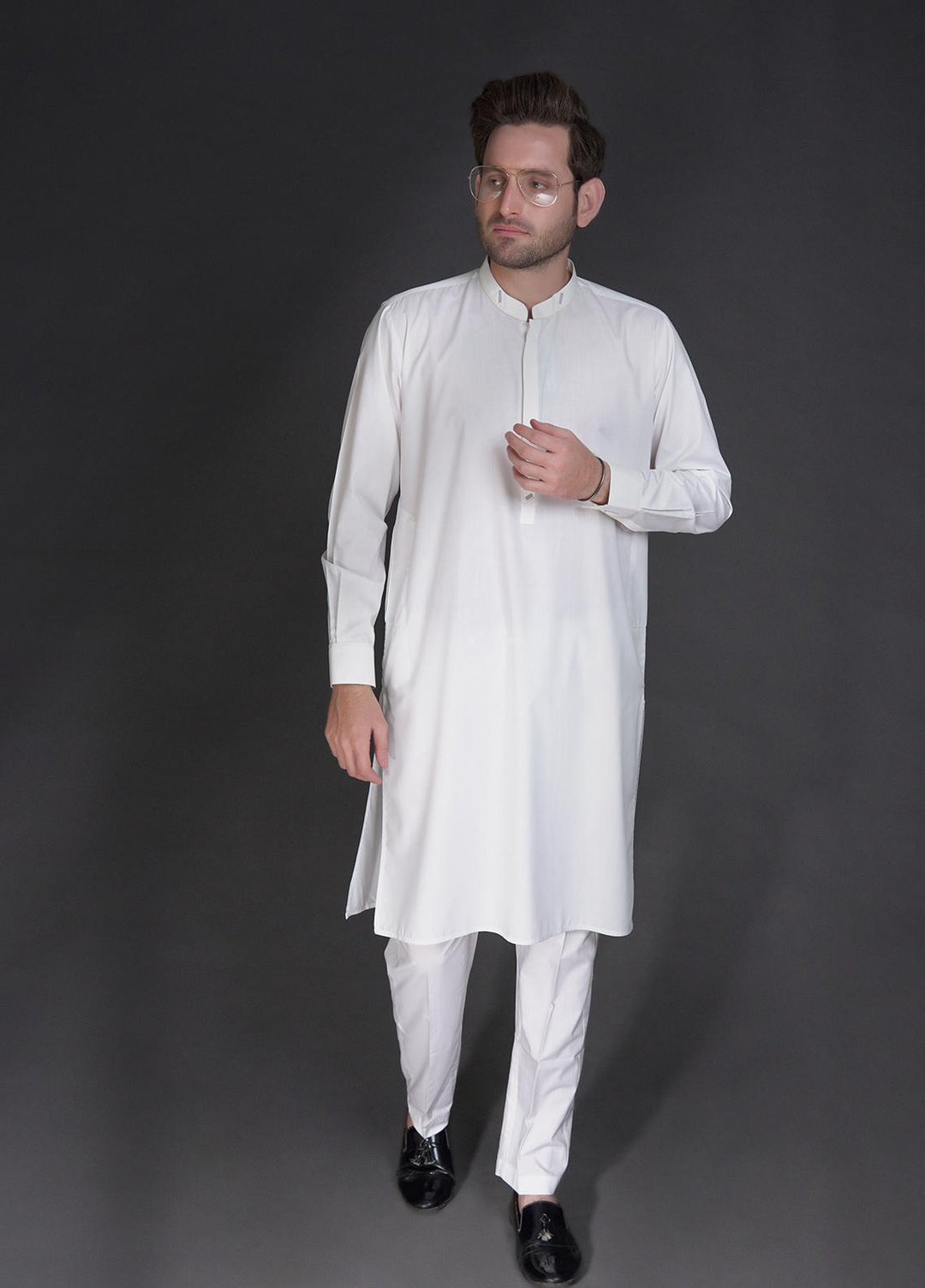 Muraqsh Blended Plain Mens Shalwar Kameez - Bosky White French Collar