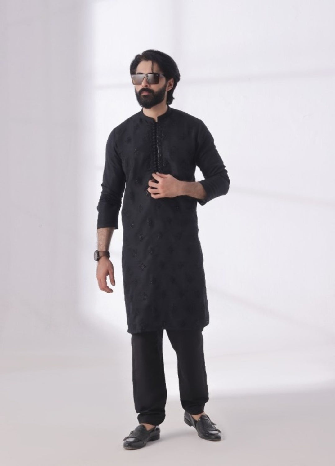 Bin Musab Raw Silk Formal Men Kurta Pajama - BM-000006 Ebony Black