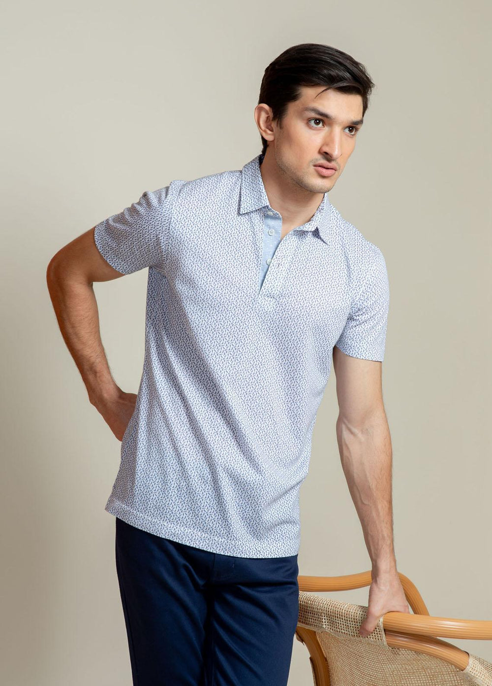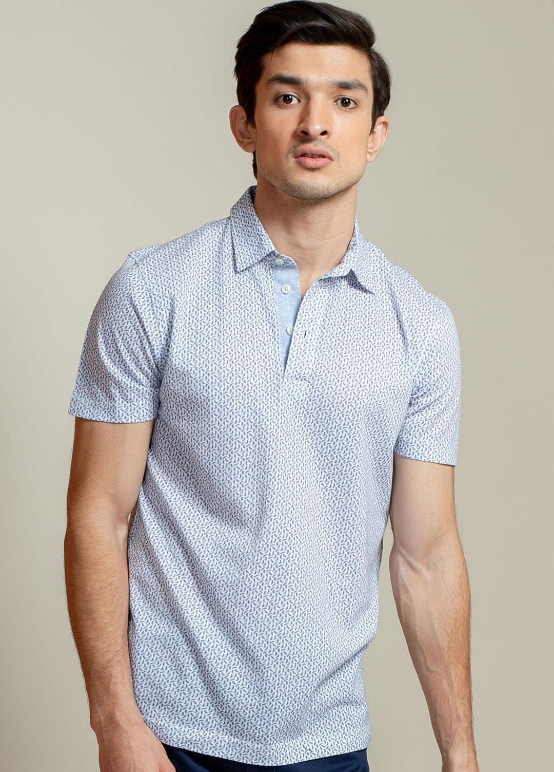Brumano Cotton Polo T-Shirts for Men - White & Blue Printed Mercerized Polo Shirt
