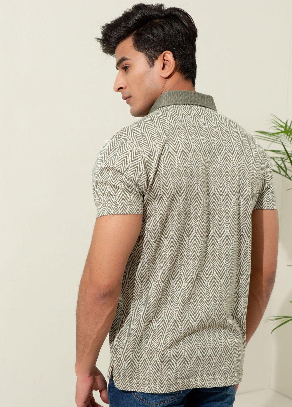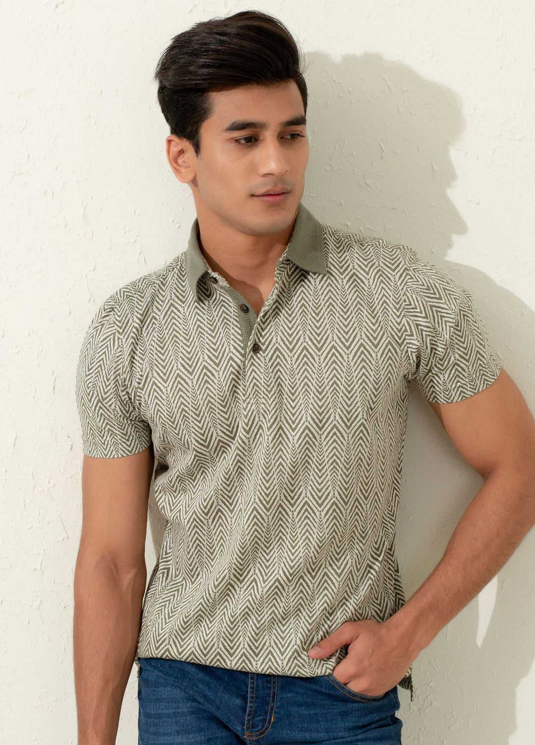 Brumano Cotton Polo T-Shirts for Men - Olive Jacquard Zig-Zag Patterned Polo