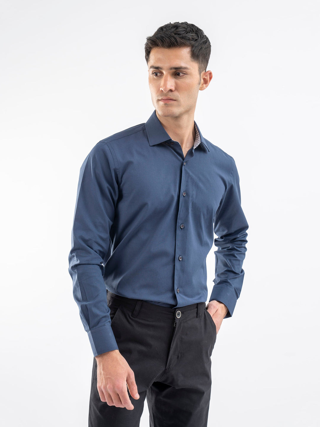 Brumano Ready To Wear Shirts Men 1 Piece Cotton Navy Blue Structured Formal Shirt With Inner Collar Detailing 0-31-025-4195 - Summer Collection