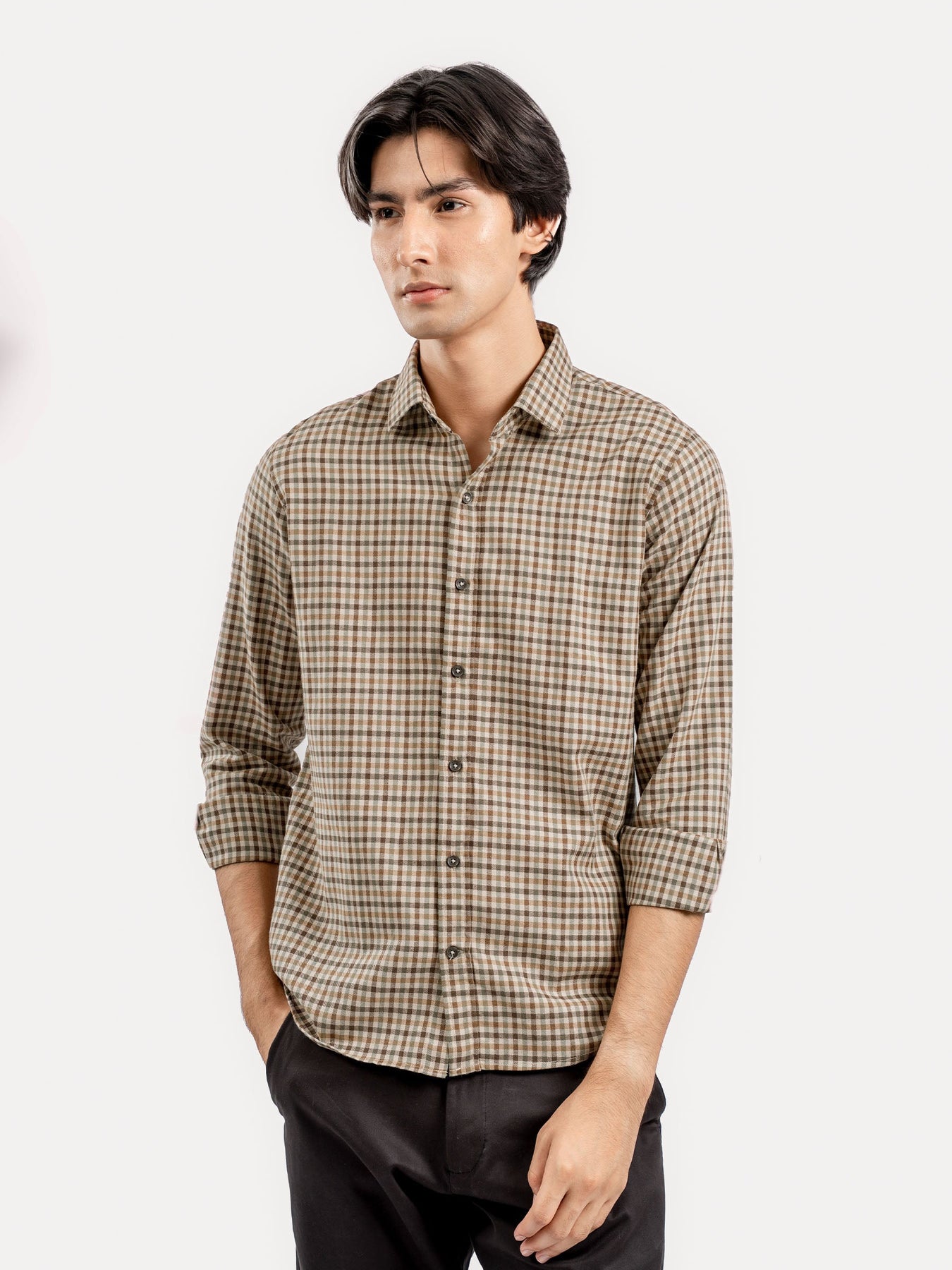 Men’s brown flannel gingham checkered shirt from FW'25 collection, made from soft, warm fabric for cozy comfort. A timeless pattern perfect for casual layering and everyday wear.