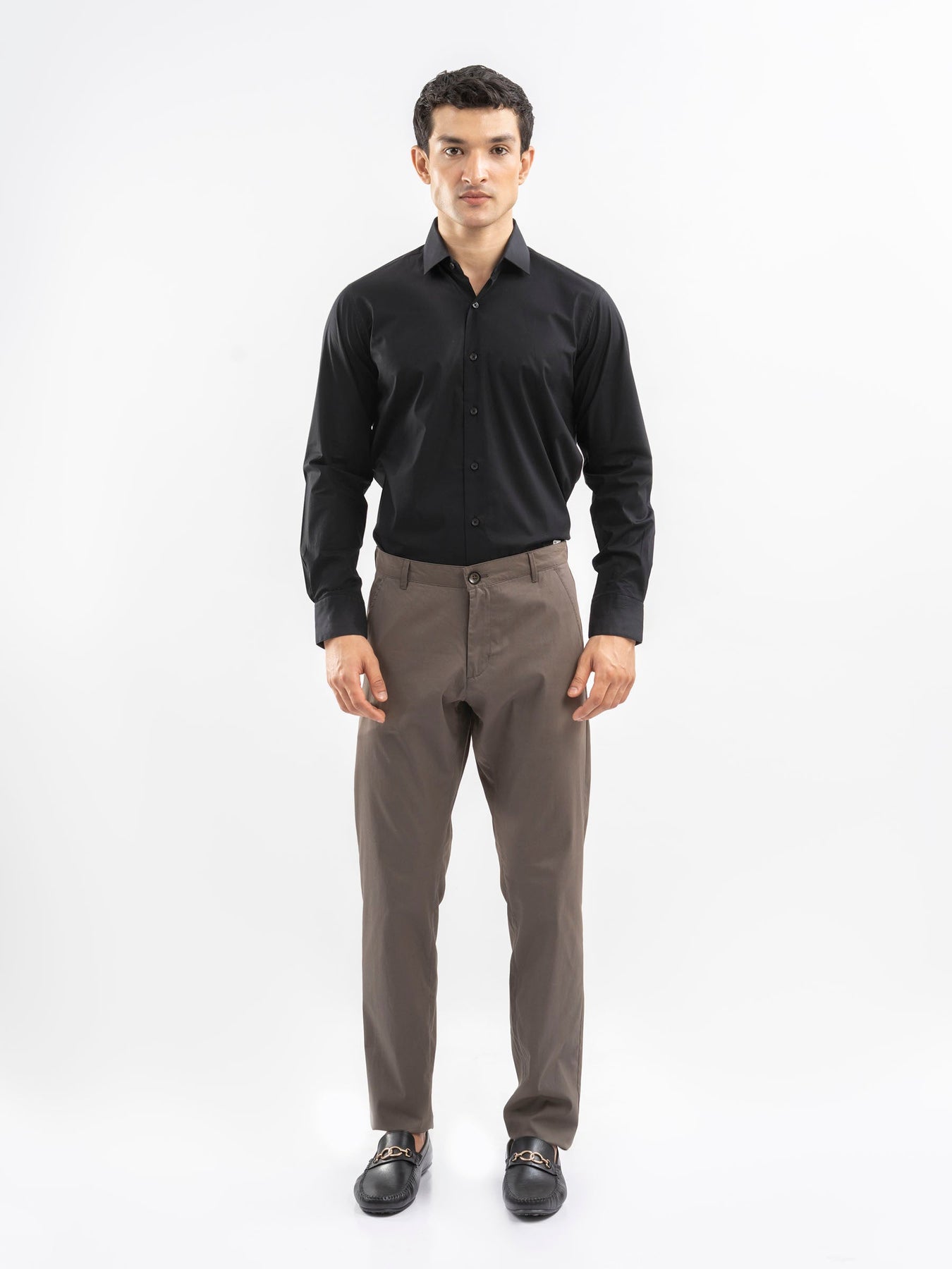 An everyday classic, this black shirt is a must-have for a formal look. Featuring shallow collar, inner ribbon collar detailing & black branded buttons for a clean formal look. Wear it with blazer, chinos or on its own