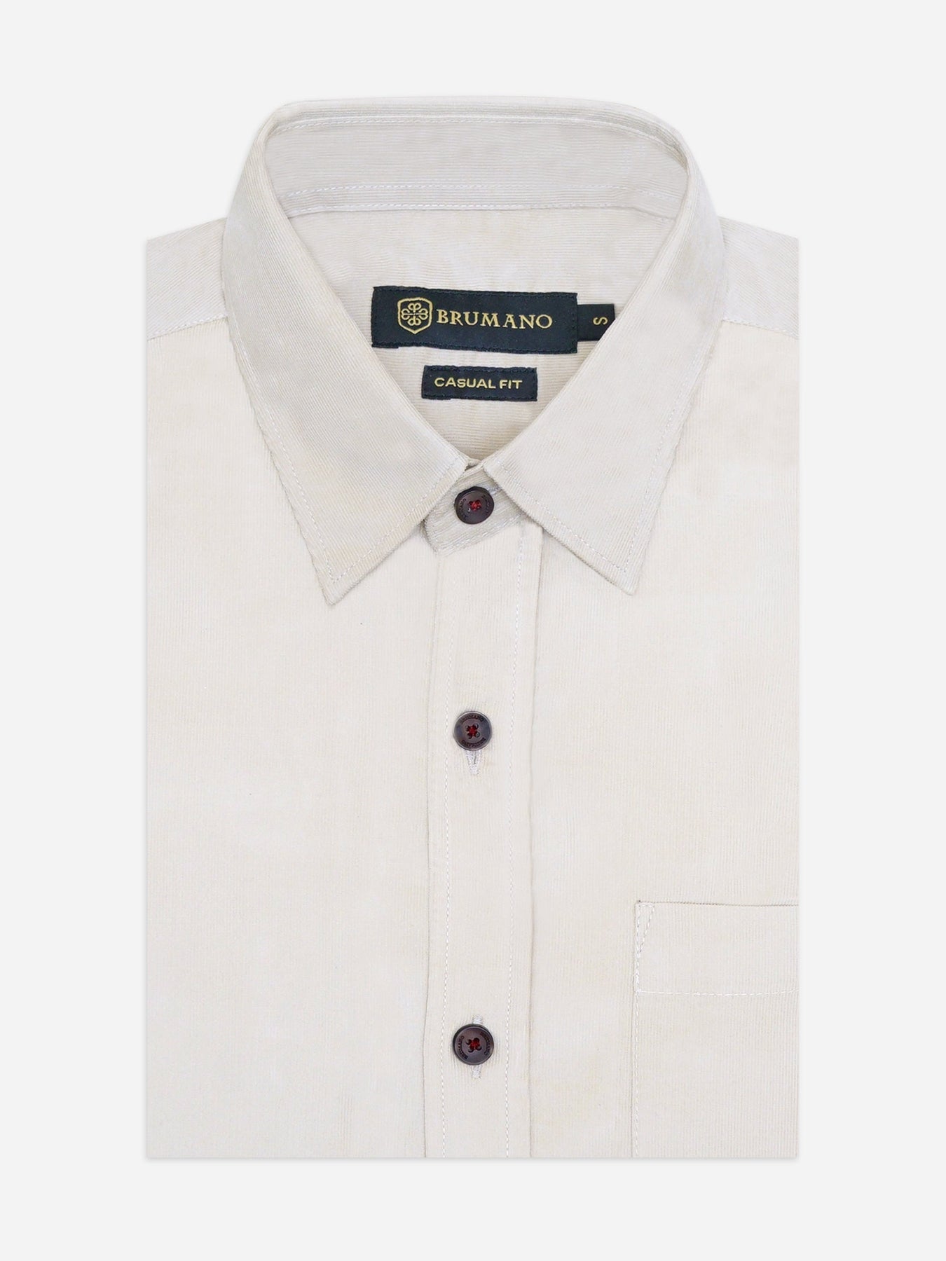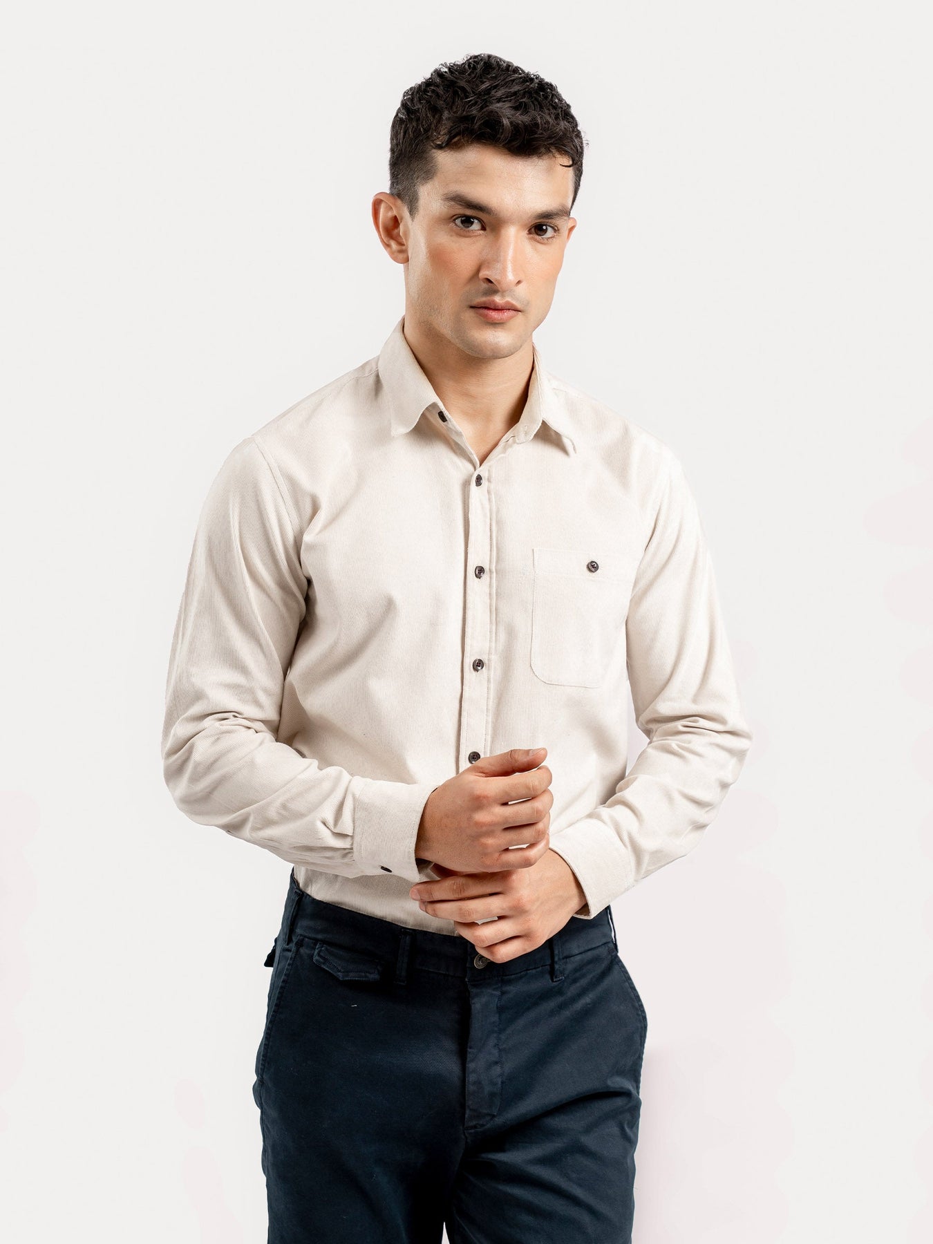 Elevate your casual style with this light beige corduroy shirt. Designed in a rich textured corduroy fabric, it offers a soft feel with a structured look. Finished with casual collar, long sleeves & font pocket while the corduroy finish adds a timeless, vintage-inspired touch. Perfect for layering in cooler weather