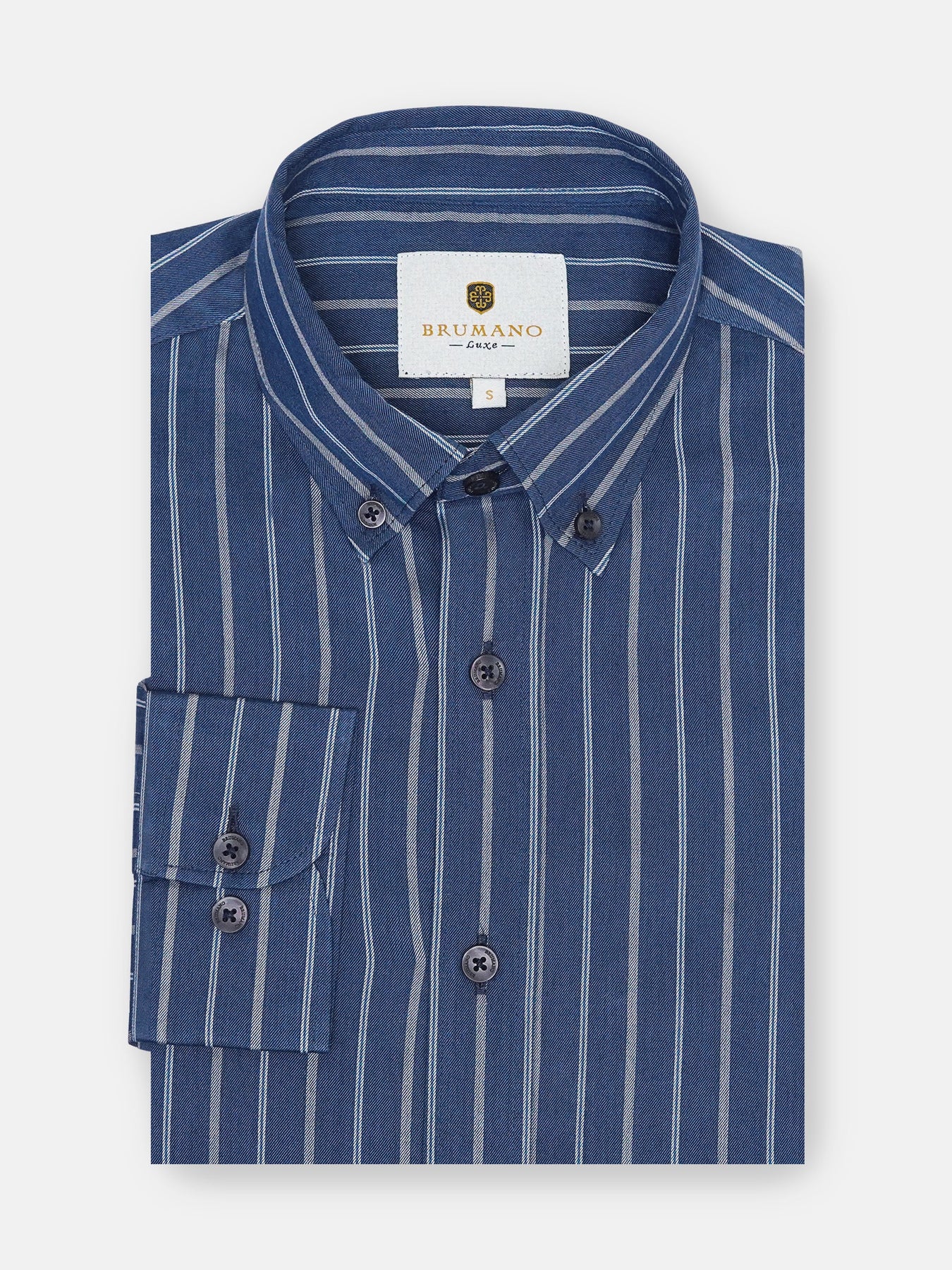 Brumano Ready To Wear Shirts Men 1 Piece Cotton Navy Blue Striped Button Down Shirt 0-32-024-2093 - Summer Collection