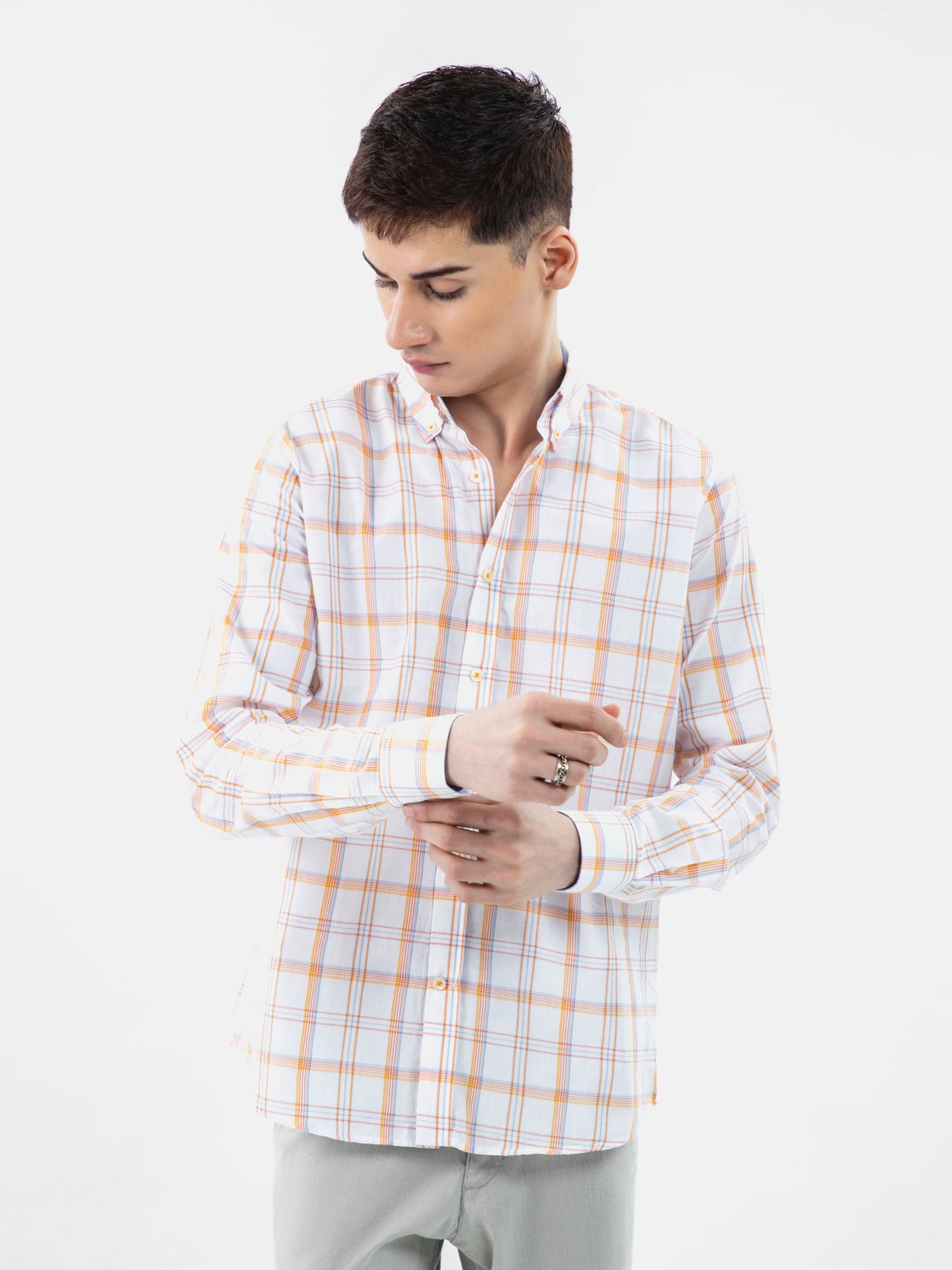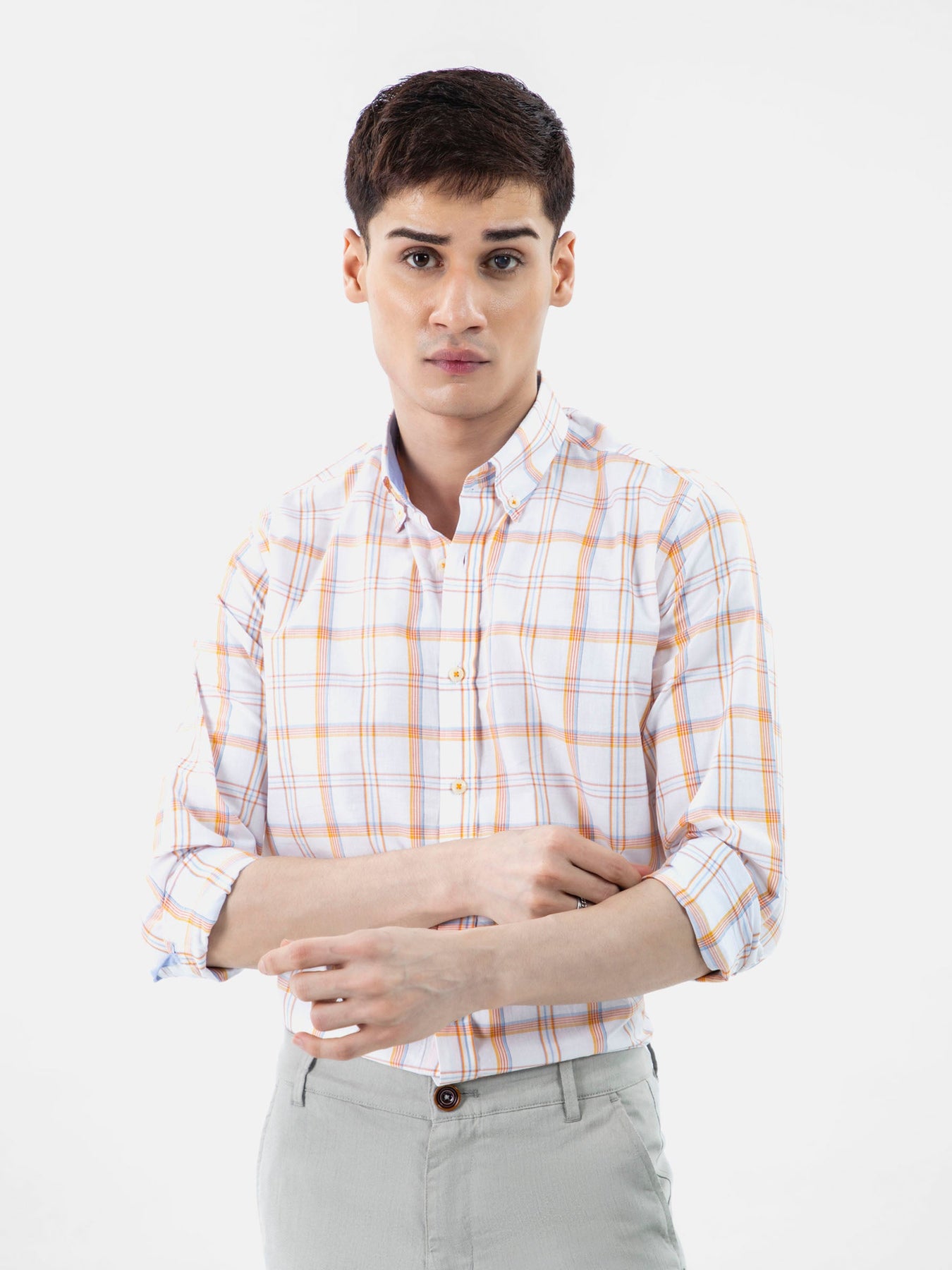 Our new white & orange checkered shirt from SS'24 collection is a must-have this season. Featuring button down collar with detailing, this shirt is perfect for casual outings. An essential for staying stylish and cool during the warmer months. Finished with inner collar detailing
