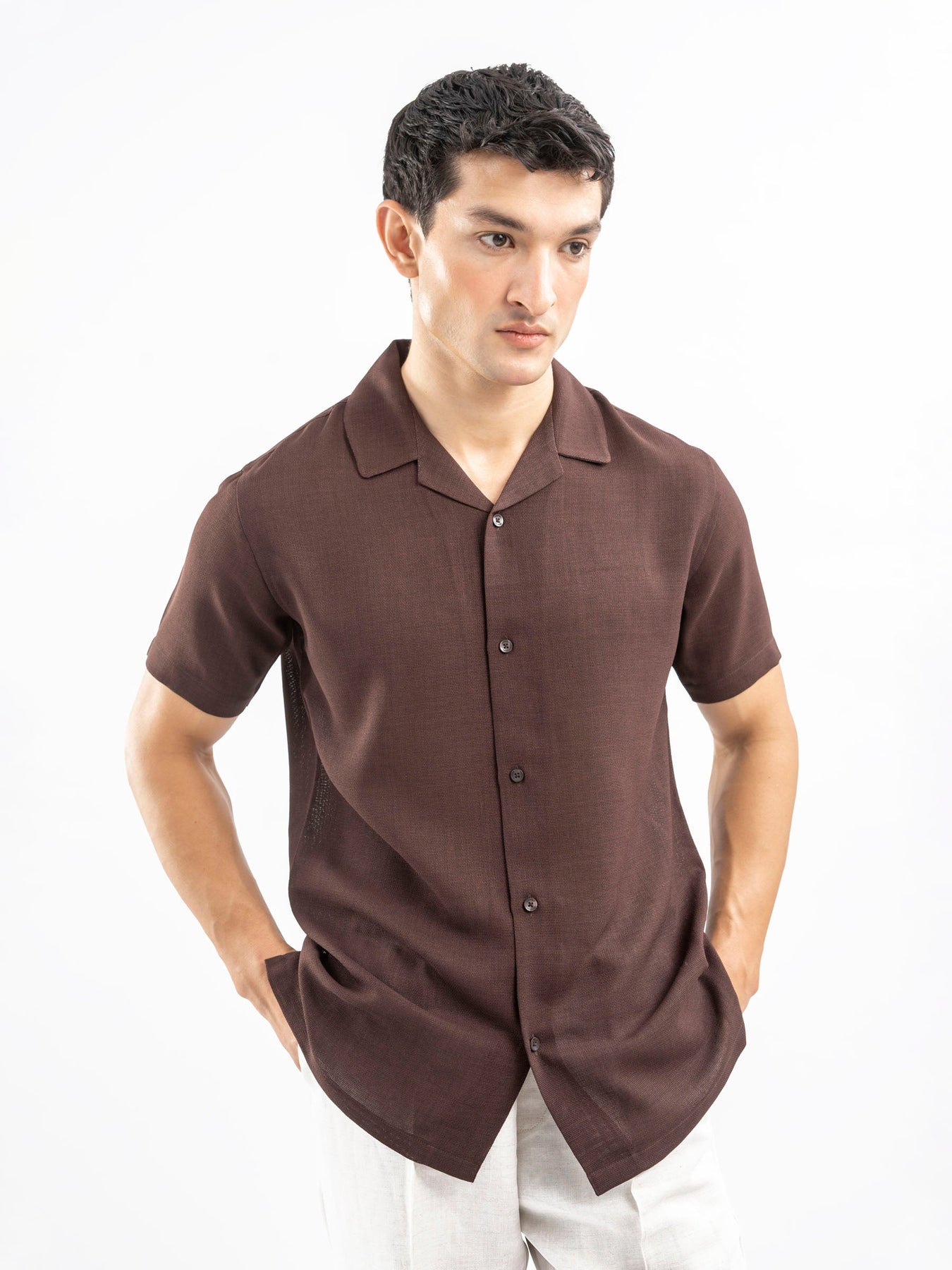 Elevate your casual style with this dark brown structured cuban collar shirt. Crafted from premium structured fabric with a clean, textured finish, it features a short sleeves, and a signature open cuban collar. Perfect for laid-back evenings or smart-casual outings, this shirt combines effortless charm with modern sophistication.