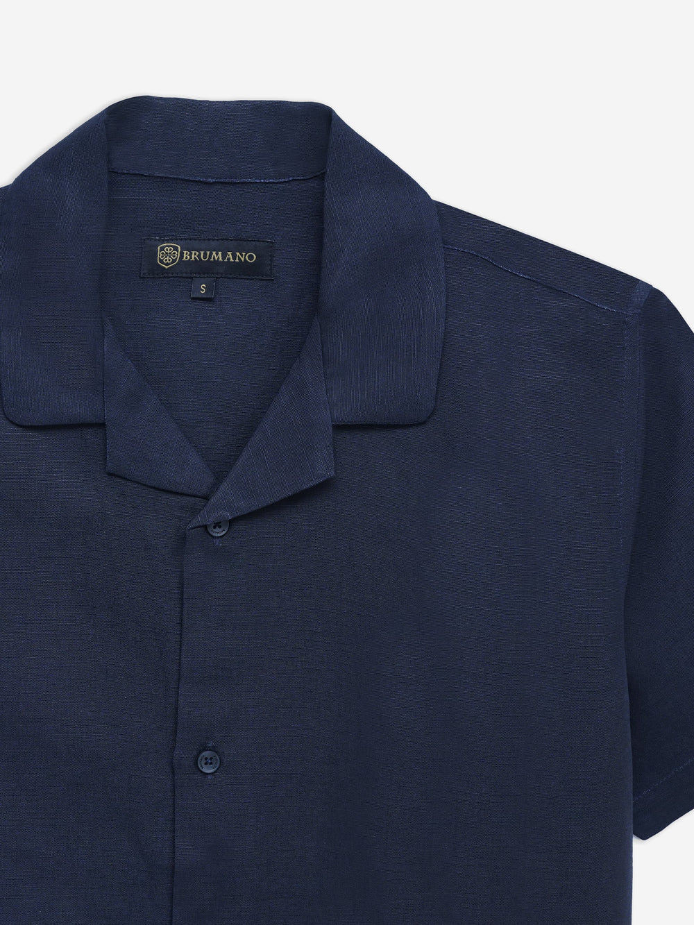 Brumano Ready To Wear Shirts Men 1 Piece Cotton Navy Blue Linen Blended Half Sleeve Cuban Collar Shirt 0-33-025-6073 - Summer Collection
