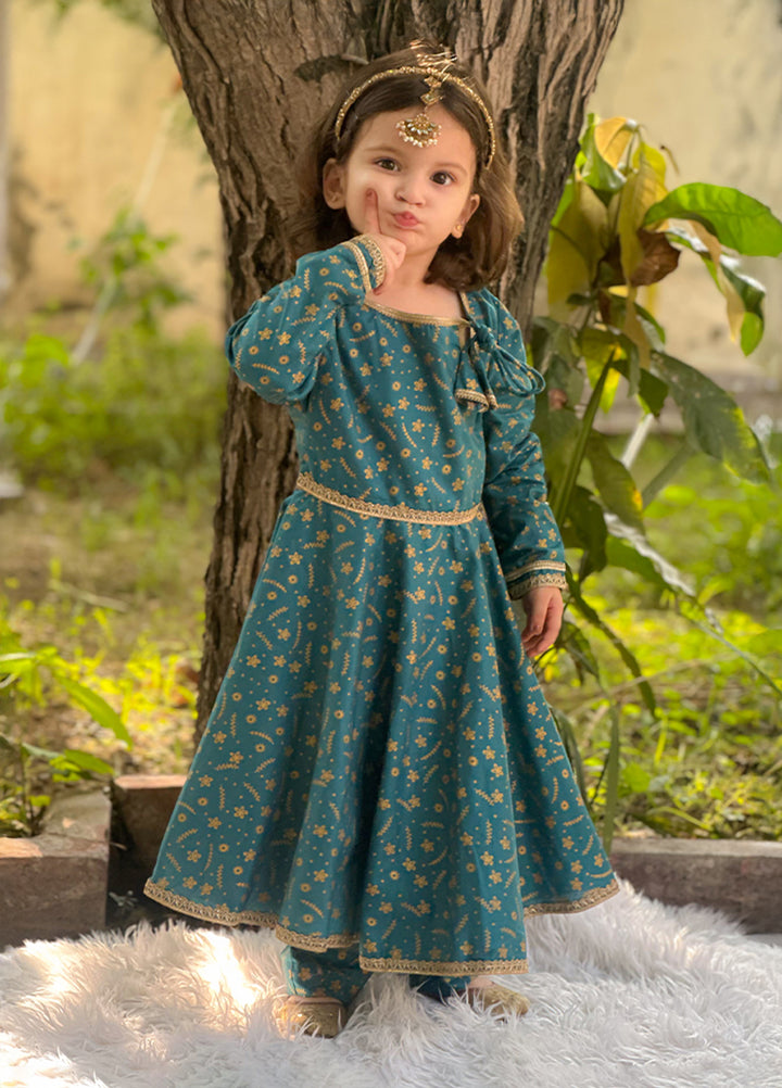 Beautiful cotton printed frock designed with an elegant neck and highlighted with golden lace for a classy touch.