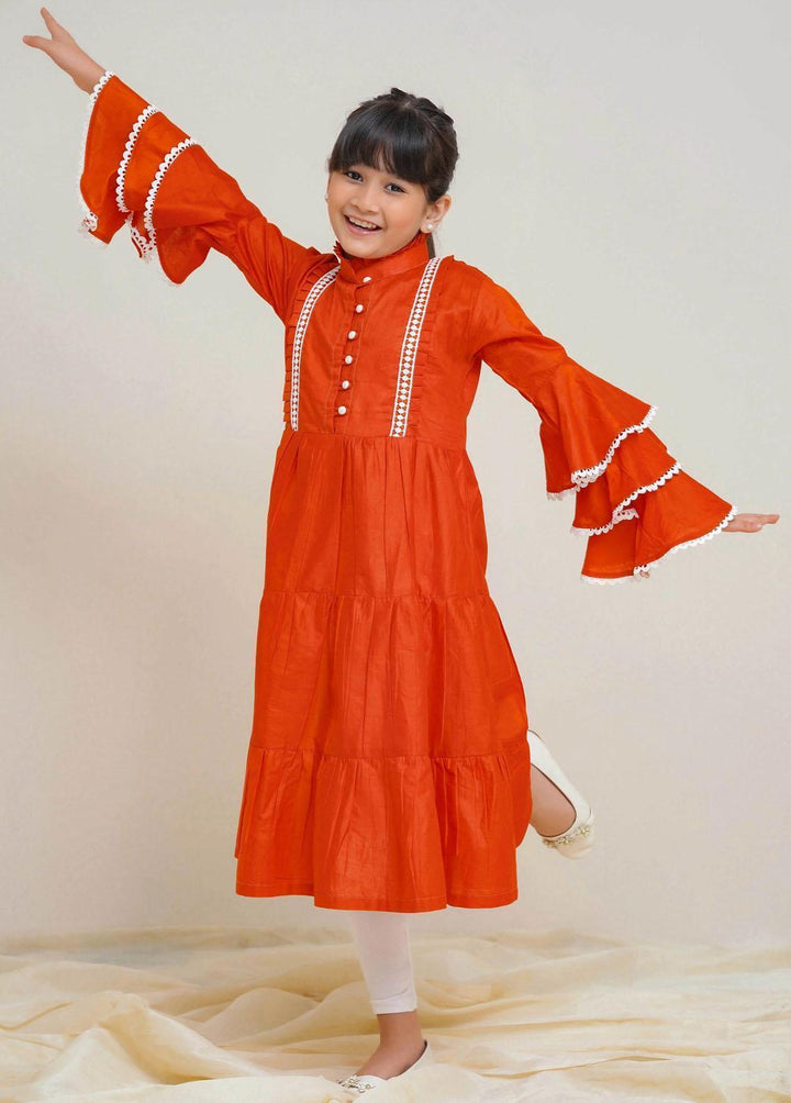 Casually Chic Embrace Comfort with Cotton long frock Top orange color long cotton frock with three layered ruffled sleeves and pearl and pearl details on the bodice.