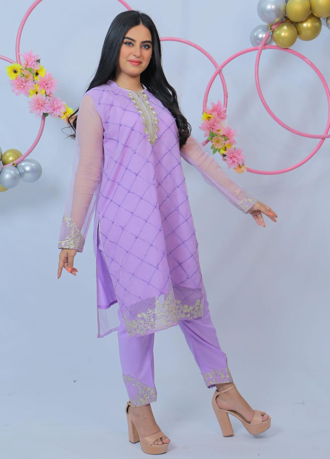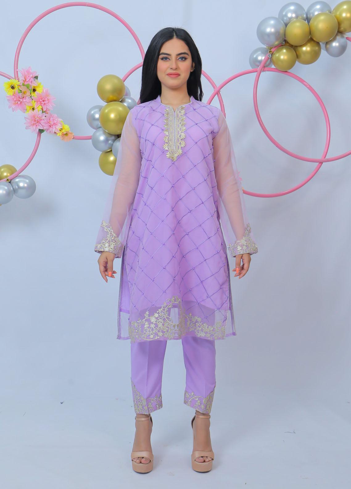 Size worn by model: Small Suit: 2 piece Fabric: Organza Sizes: S,M,L Detailing: Machine embroidery on daman, sleeves, neckline and trouser hem, astonished with pearls detailing over all Color Options: Lavender and Maroon