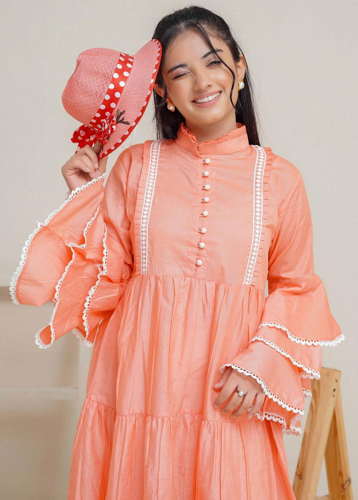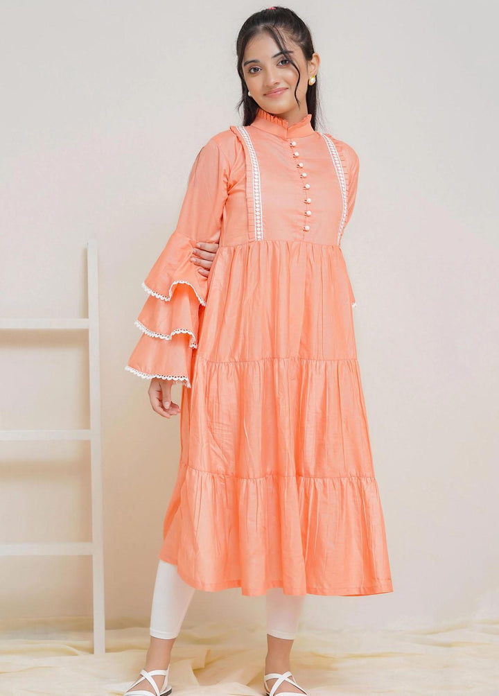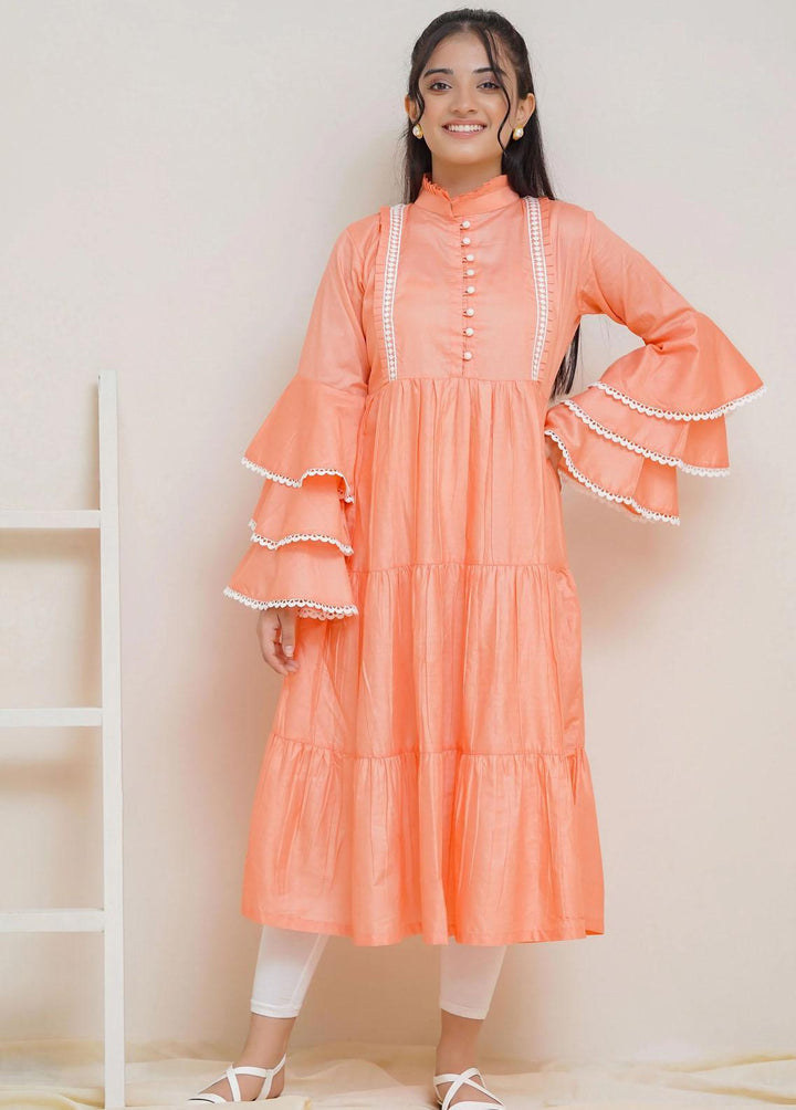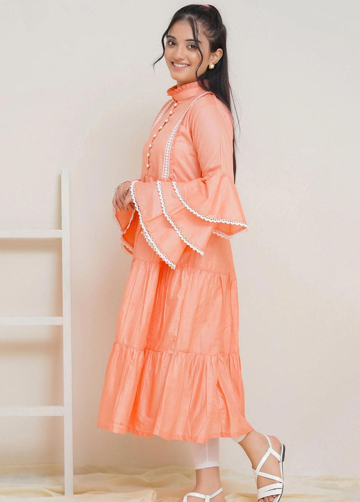 Playful Elegance Casual Cotton Long Gowns for Young Fashionistas.Top Peach color long cotton frock with three layered ruffled sleeves and pearl details on the bodice.