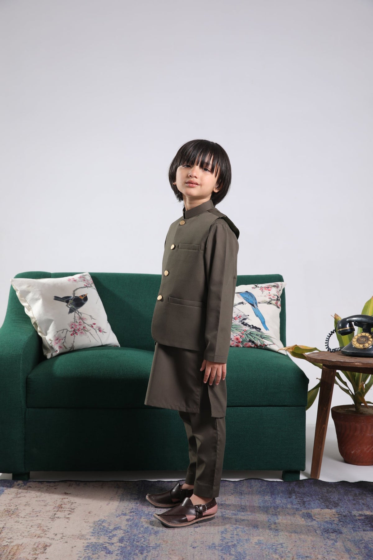 Muraqsh Ready To Wear Solids Cotton Boys Olive Green Kurta Trouser with Blended Waistcoat Round Cut Buttoned MUR-OGKTW - Summer Collection