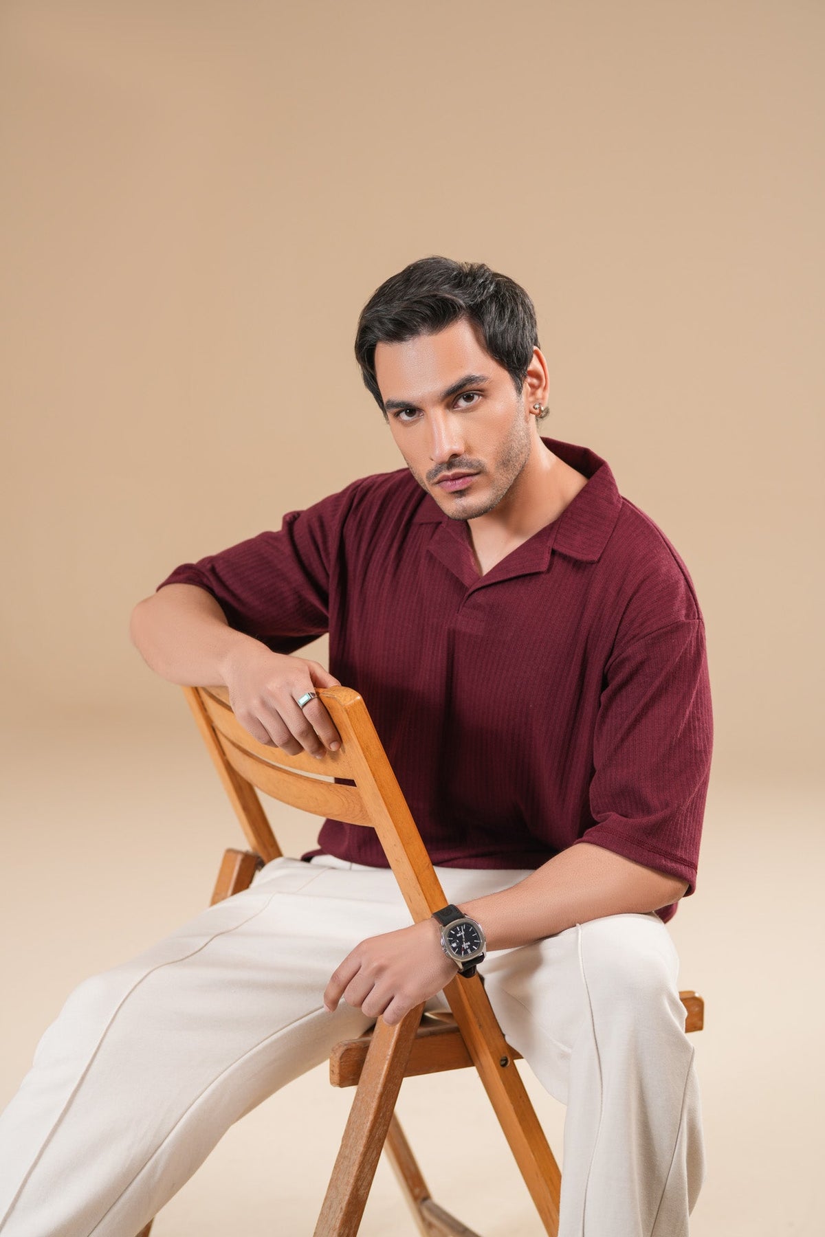 Ribbed Knit Polo With A Boxy Fit And Revere Collar. Deep Maroon Shade Adds A Modern Edge To Your Winter Wardrobe With Comfort And Effortless Style
