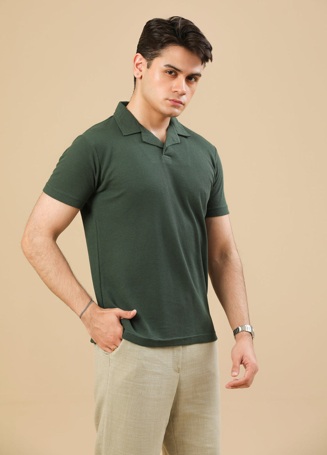 Experience ultimate comfort and style with our Waffle Bottle Green Revere Polo. The lapel collar and knitted texture add a touch of sophistication, while the silicon wash ensures a soft hand feel. Designed for a smart fit, this polo is perfect for any occasion.