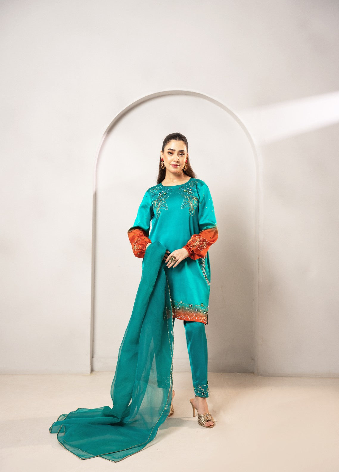 Make a refined style statement with this striking 3-piece Muse Touch Shamooz Silk ensemble, featuring a beautiful two-tone palette of sea green and burnt orange. The luxuriously soft shamooz silk fabric lends a natural sheen and graceful drape, while subtle embellishments add texture and a hint of sparkle to the richly designed shirt. Paired with a coordinated trouser in the same luxe fabric, the outfit maintains a sleek and elegant silhouette. A plain matching dupatta balances the overall look, letting the two-tone contrast and embellishment work shine without overwhelming the ensemble. Perfect for festive gatherings, semi-formal events, or elegant daywear β this outfit captures the essence of modern tradition with a bold yet graceful flair.