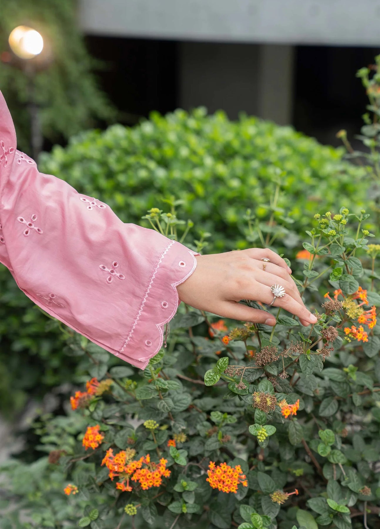 The Mysa Lawn Embroidered 3 Piece Stitched set in elegant pink features a soft cotton lawn shirt with intricate embroidery, combining comfort and sophistication. It is paired with matching cotton lawn stylish trousers, offering a modern and flattering silhouette suitable for a variety of occasions,