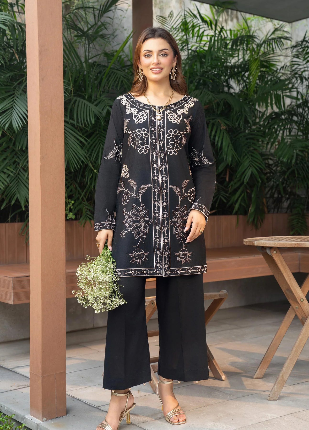 The Rhea Lawn Embroidered 3 Piece Stitched set in classic black features a cotton lawn shirt adorned with delicate sequin embroidery, adding subtle shimmer and sophistication. Paired with a matching cotton lawn bell bottom, it offers a flattering and comfortable fit. The silk embroidered dupatta completes the ensemble with a luxurious touch, perfect for elegant occasions.