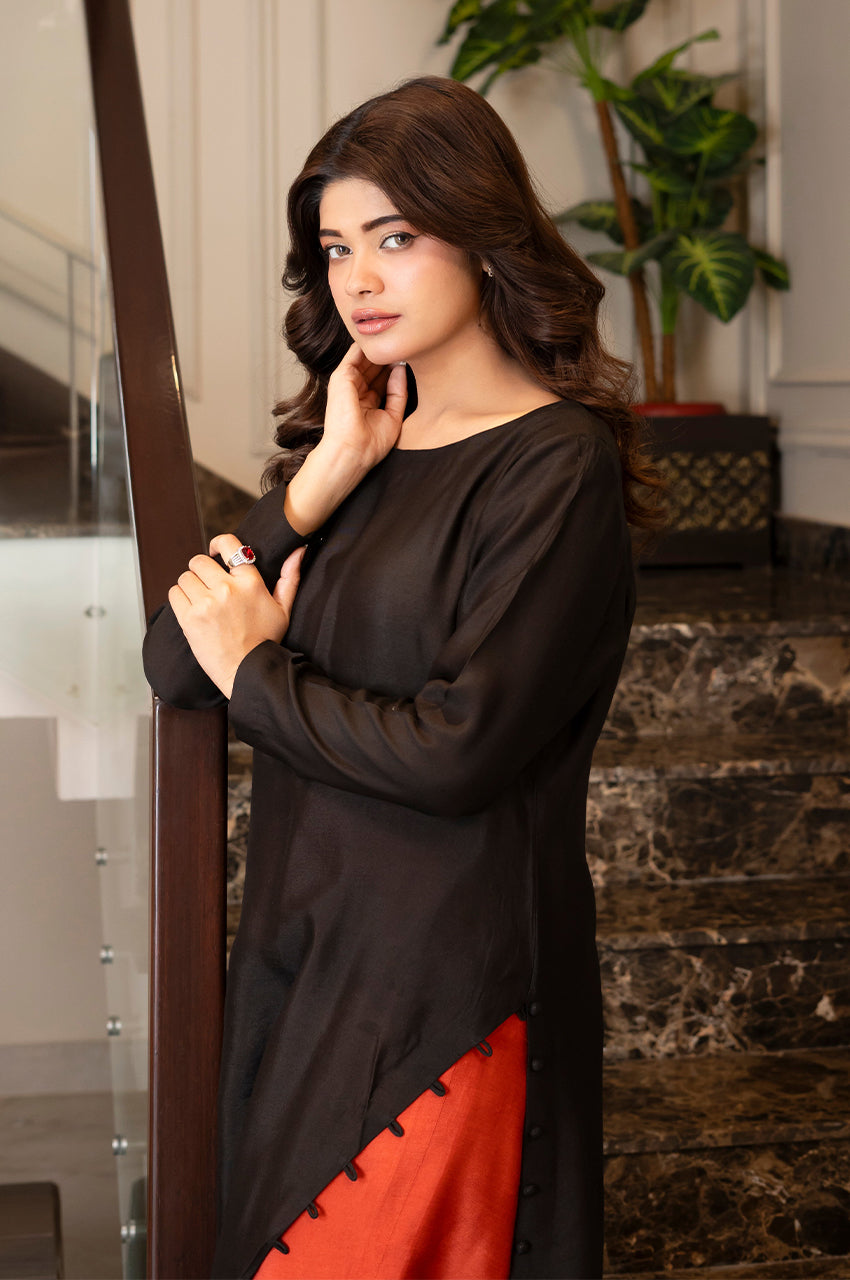 A chic black silk set with subtle detailing, perfect for casual evening wear.