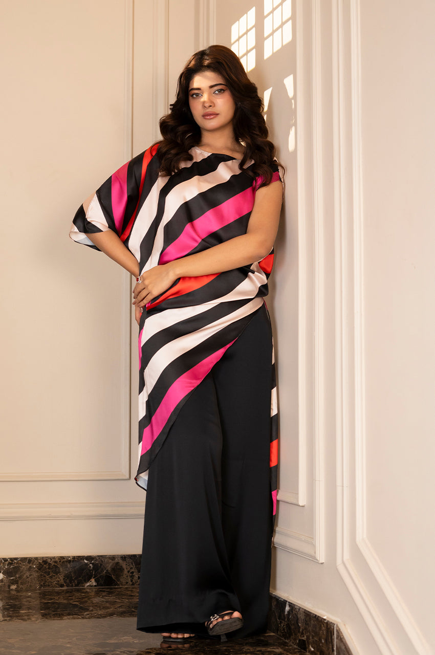 A minimalist and refined silk ensemble highlighting a clean, polished look.