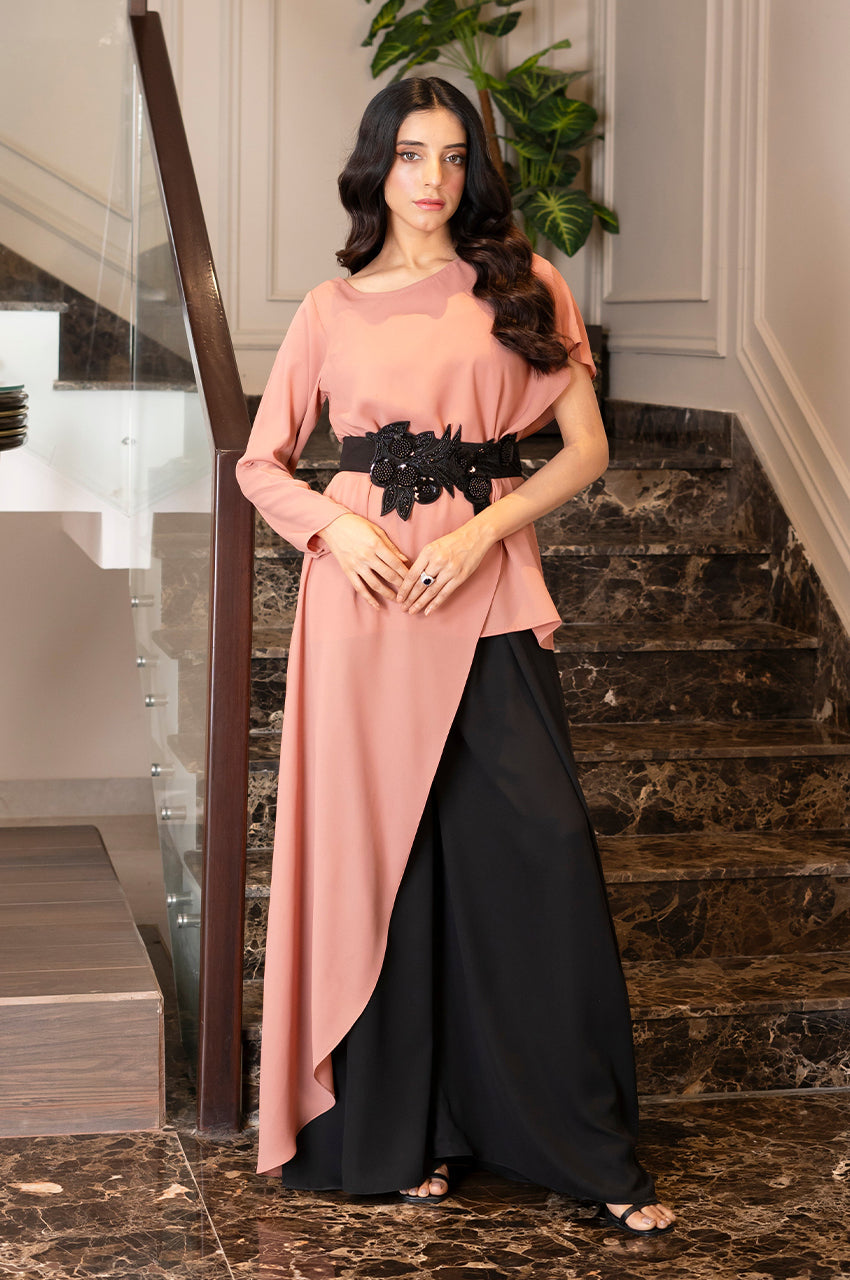 A modern raw silk outfit featuring a contemporary cut and tailored pants.