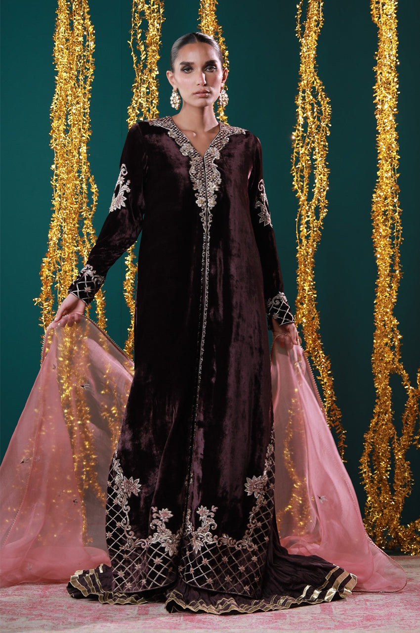 A stunning plum velvet ensemble with shimmering handwork on the neckline and sleeves.