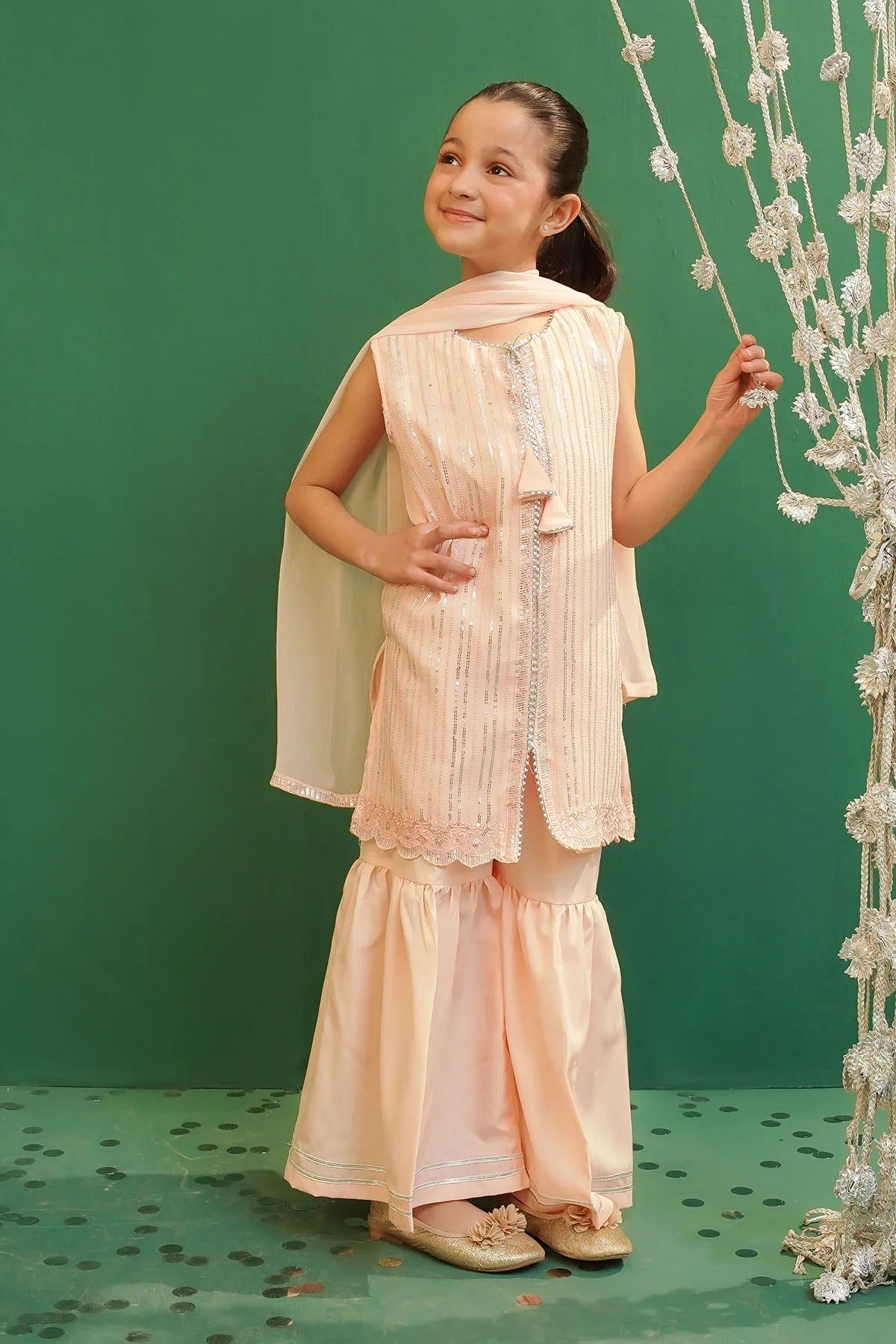 Bottom: Peach Malai Crepe Gharara Pants With Laces