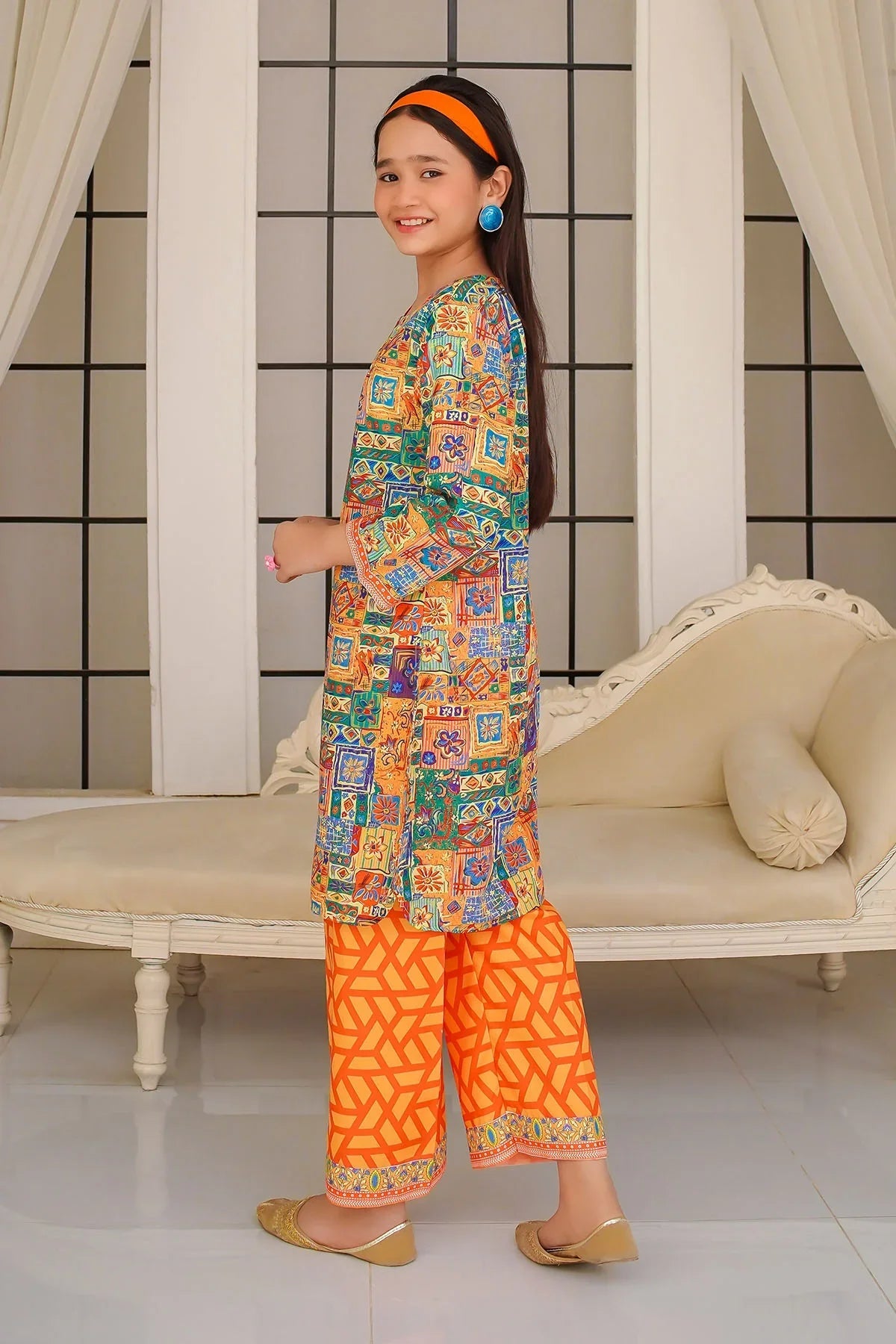 Bottom: Orange Digital Print Swiss Lawn Trouser"