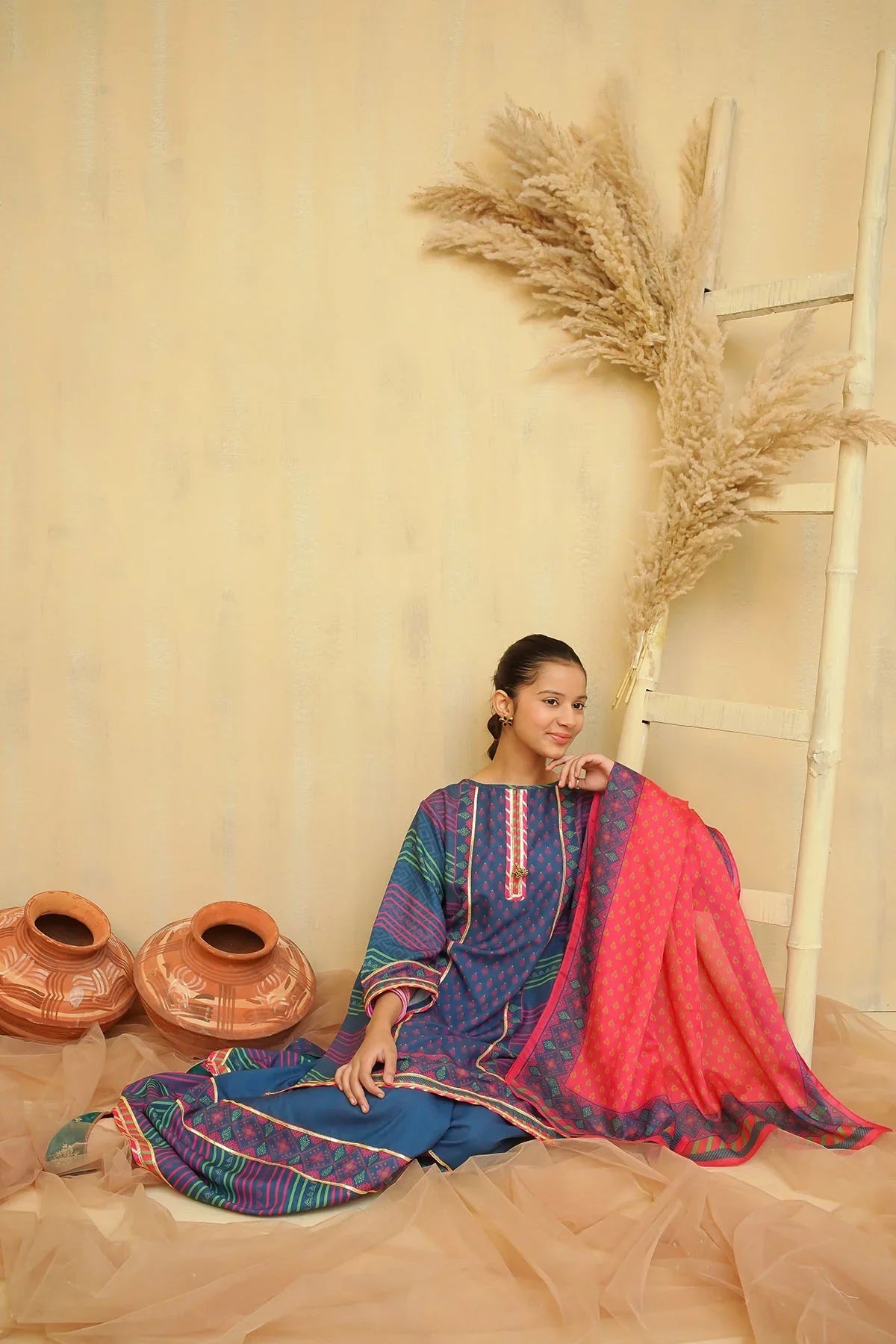 Bottom: Teal Blue Swiss Lawn Digital Printed Gharara Pants with Gota Laces