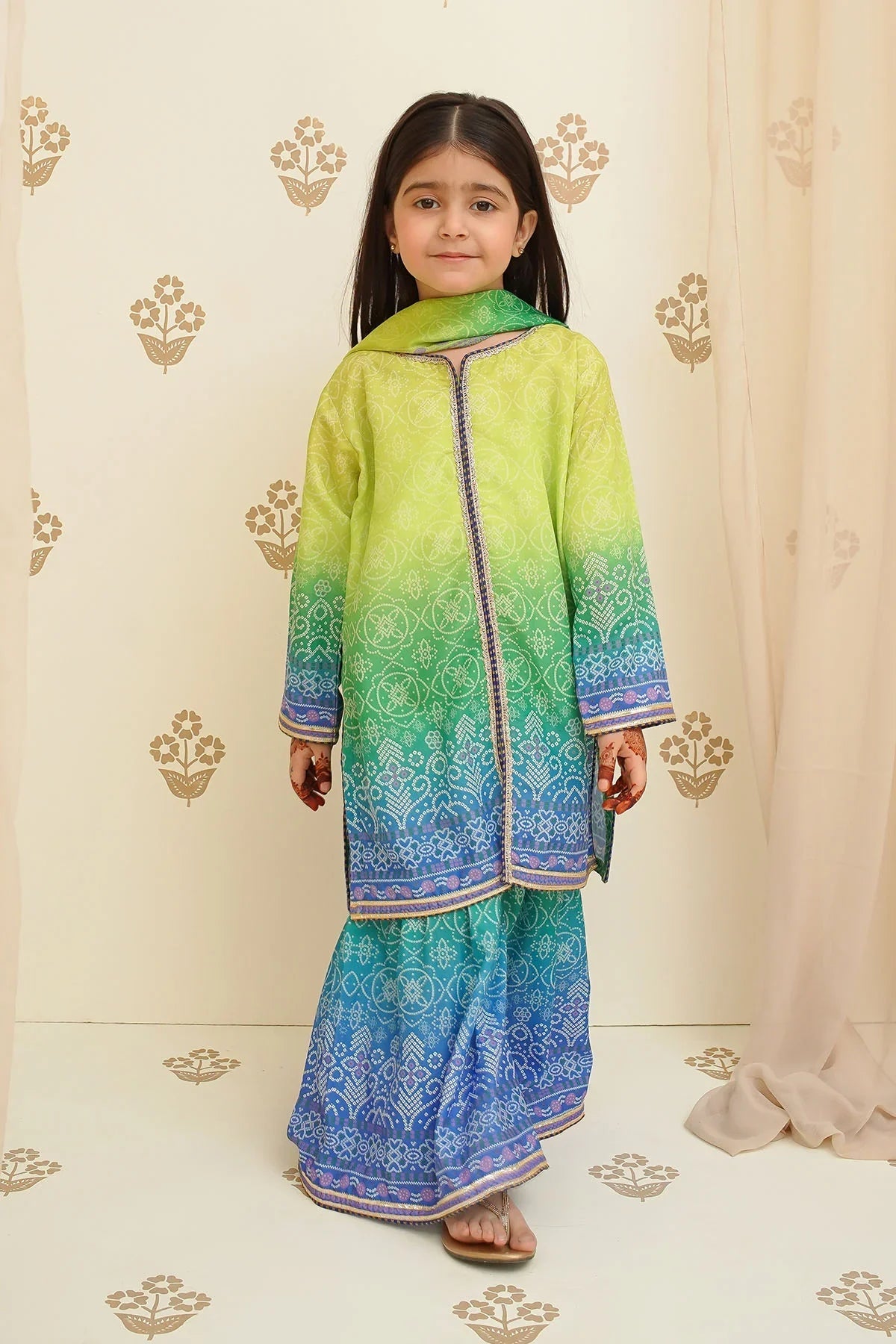 Bottom: Lime Green three tone Chunri Swiss Lawn Digital Printed Gharara Pant s